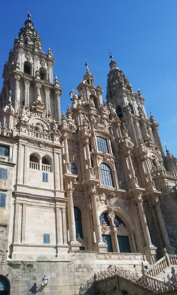 Ich bin dann mal weg – na hier ganz sicher nicht. Santiago ist eine Welt für sich, aber unter Garantie ist man hier nicht alleine oder weg von irgendwas. Der Platz vor der Kathedrale hat definitiv etwas Erhabenes, es ist strahlender Sonnenschein und bei aller Dominanz von schwerem Stein ergibt sich etwas Luftiges, nahezu Metaphysisches im Ensemble. Contrapunkt sind die Heere von Menschen, die den Platz mit – na nennen wirs mal wertneutral „Leben“ füllen. Neben vielen ganz üblichen Touris sind das auch noch im Oktober höllisch viele Pilger.