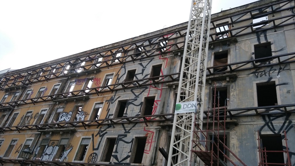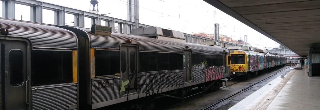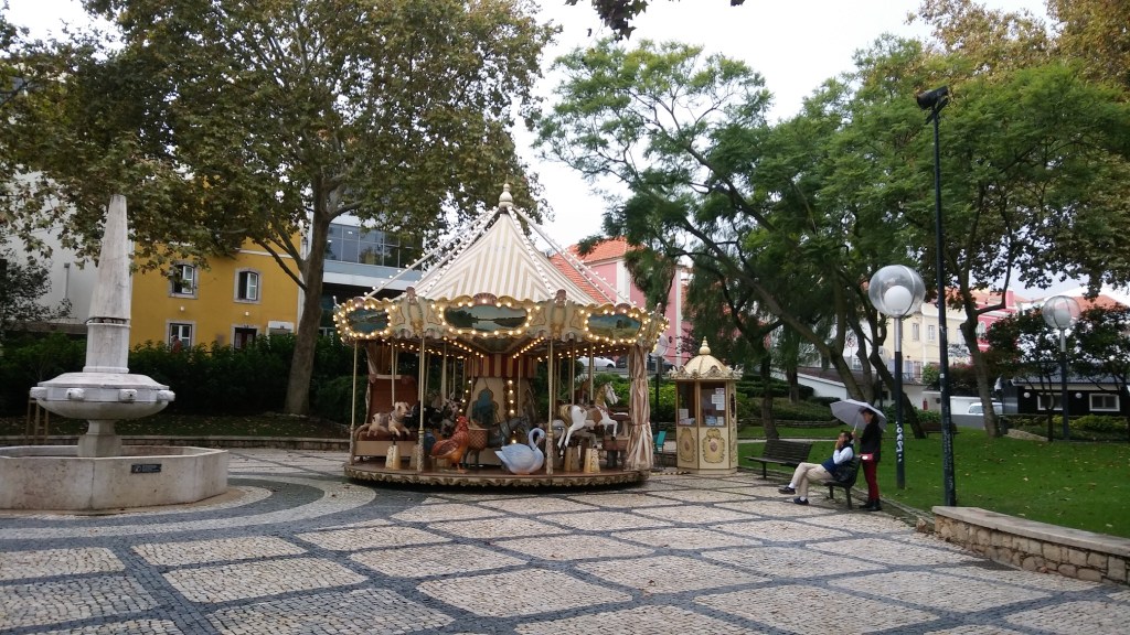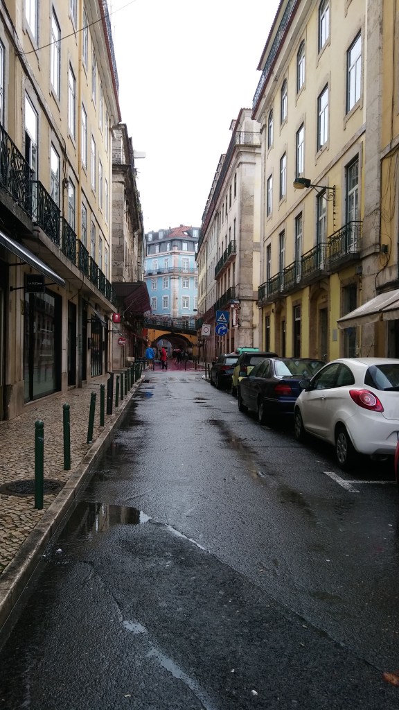 Von Cascais bis Lissabon fährt eine hervorragende S-Bahnlinie, ca. 40 Minuten von Endbahnhof zu Endbahnhof. Die Züge fahren pünktlich und sind günstig, die Linie führt immer an der Küste entlang und offenbart spannende Blicke auf Meer und Stadtlandschaft. Man merkt auf dieser Linie, dass Lissabon eine uralte Handels- und Industriestadt ist, der Charme der verfallenden Anlagen fängt mich sofort ein. Ich gehe bei Sonnenschein los und komme im strömenden Regen an. Von allen Balkonen tropft Wasser auf die gepflasterten Straßen und zwar in diesen ekelhaft großen Tropfen, die unangenehmer sind, als durchgehender Regen.