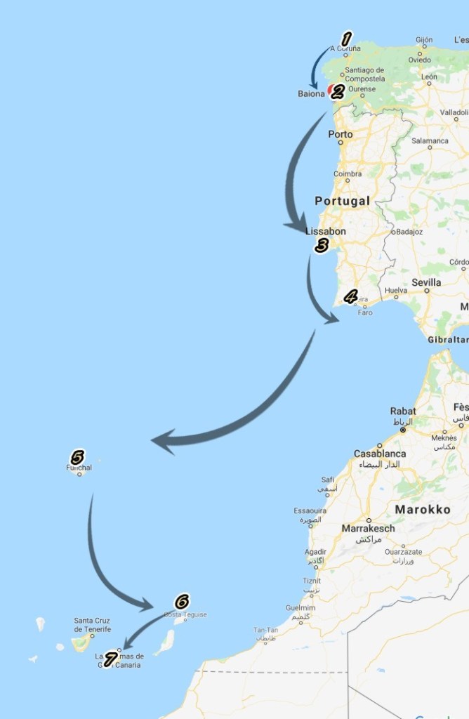 Sorry, lieber Leser, dieser Einstieg in den Text stammt eher von Grumpy Old Boy als vom entspannten Segelonkel. Ich gelobe Besserung. Und dass ich auf dieser Seite versuche, einigermaßen regelmäßig Reiseimpressionen festzuhalten. Dazu brauche ich aber Netz, und das gibt’s nur in den Häfen: A Coruna – Bayona – Cascais – Portimao oder Lagos – Madeira – Gran Canaria. Ich versuche Updates regelmäßig zu machen, kann aber sein, dass ich in buddhistische Seglerstarre verfalle und nur noch auf das Wasser starre und auf einem Strohhalm herumkaue.