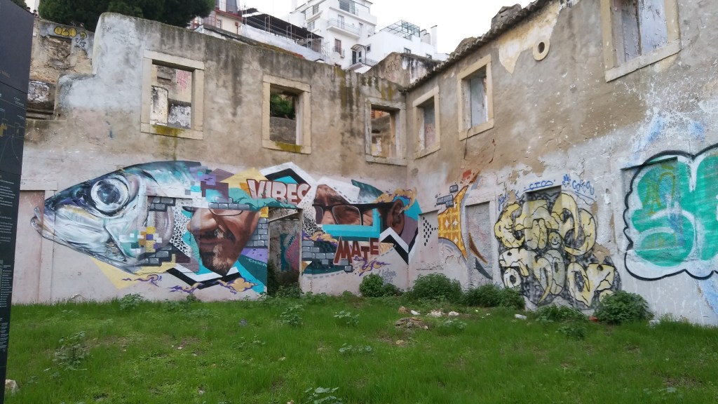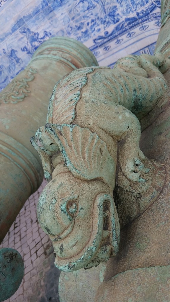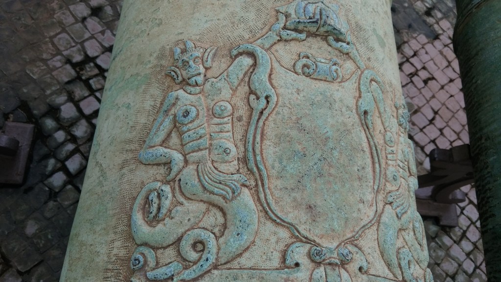 Gegen später stolpere ich ins nationale Militärmuseum Portugals, gelegen direkt vor den riesigen Kreuzfahrtschiffen am Kai, dessen Besuch umsonst ist. Es besteht zu 95 % aus Kanonenläufen zwischen 1450 und 1900. Ich stelle fest, dass ich Kanonenläufe spannend finde, nicht nur, weil ich mich ständig mit Geschossen auseinandersetze, sondern weil auf alten Kanonen Schriftzüge, Wappen und Verzierungen zu entdecken sind. „This piece was made by Thomas Bancroft of Birmingham.“ Der Nächste Lauf ist kurz und mit japanischen Zeichen bedeckt, der übernächste riesig und voller arabischer Sprüche. Die Eisenrohre stehen im Inneren rostsicher, im Hof stehen die Bronzegeschütze, die witterungsbeständig sind. Nach einer Stunde Kanonen gehe ich Kaffeetrinken, versuche (erfolglos) mit der wahnsinnig sympathischen Kelnerin zu flirten, gerate Richtung Castello.