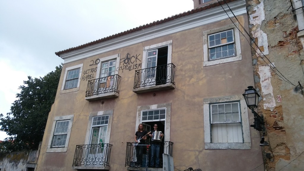 Auf dem Balkon eines besetzten Hauses stehen zwei Typen mit E-Gitarre und Akkordeon und produzieren Gipsy-Swing für die Touri-Ströme. Über den leeren Fensterhöhlen steht „Fuck Capitalism“, am Balkongitter hängt ein buntes Körbchen für milde Gaben. Aber der Gipsy-Swing ist astrein. Vor dem Castello sieht es aus wie vor dem Tokapi-Palast in Instanbul oder den Uffizien in Florenz, lange Schlangen von Menschen, kein Bock zum Anstehen.