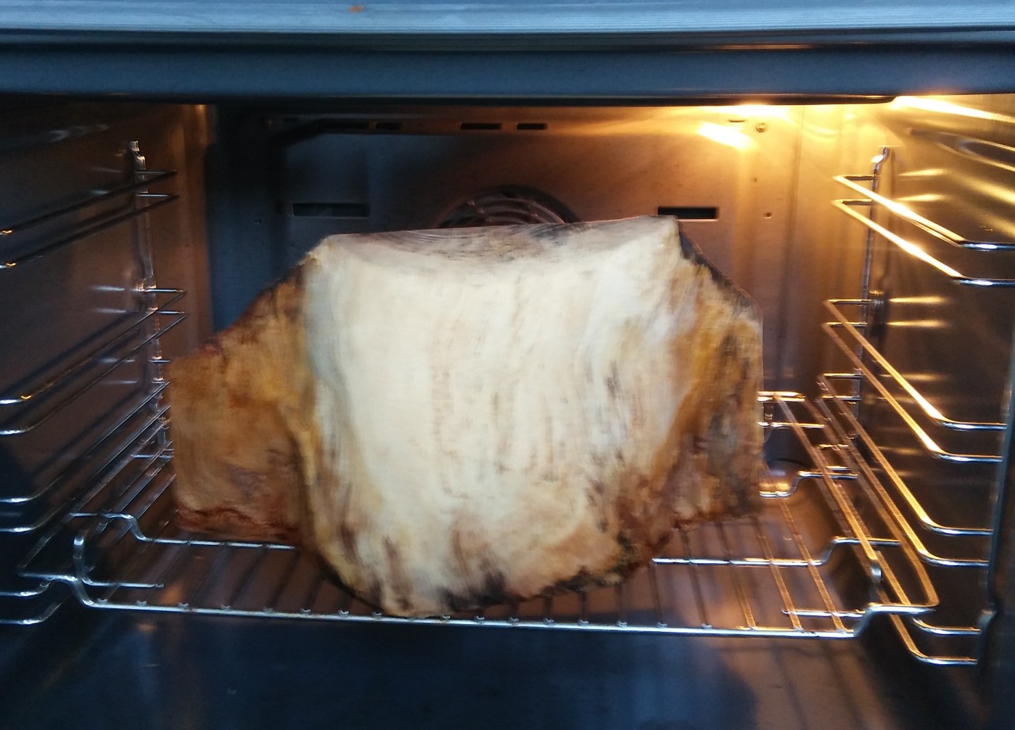 Dann kommt der Vorgang, der mein Karma sicherlich wieder etwas in Richtung Regenwurm (eher wohl Borkenkäfer, als Strafe) zieht: Thermische Holzwurmbehandlung. Hört sich geil an für den Akt, ein Stück Holz bei 85 Grad eine Stunde in den Backofen zu stellen. Zuvor wurde der Klotz noch einmal gründlich gewässert, weil ich Angst hatte, dass die Hitze die Trocknungsrisse des alten Brocken zu tief aufreißt.