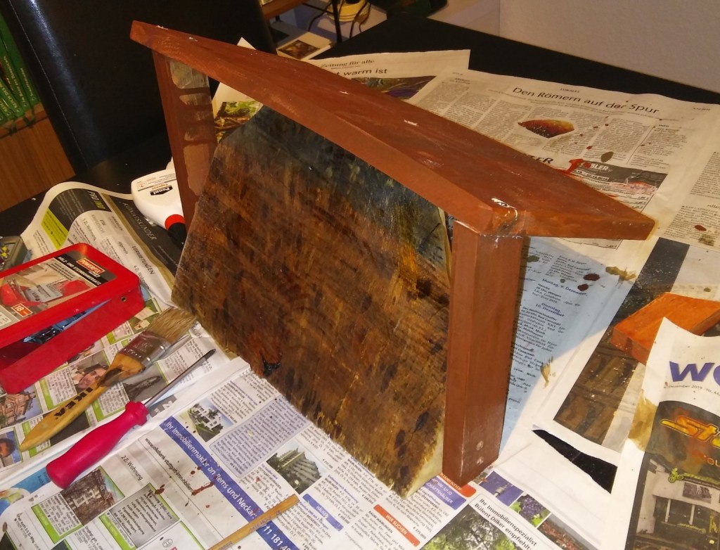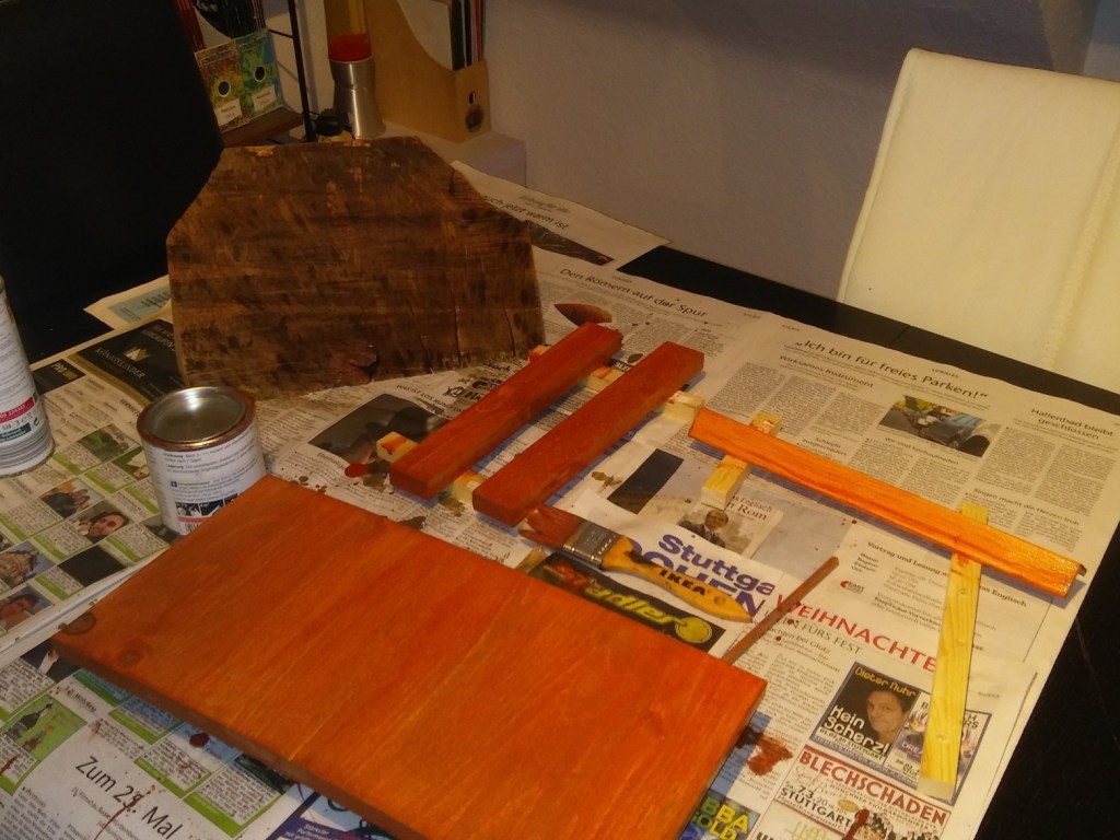 Das Hotel braucht ein Regendach, Ziel war es alles mit Resten, die so herumliegen, hinzukriegen. In meiner Restholzkiste fanden sich noch zwei Lattenabschnitte und ein kleines Verbundholzbrett in der passenden Größe. Zunächst bekamen die Bauholzteile einen gründlichen Anstrich mit alter Ikea-Behandla-Lasur, danach mit einem vergessenen ziemlich orangen Möbellack. Als der fertig war gab’s noch eine kräftige Schicht Sprüh-Klarlack, für den Glanz und als Oberflächenversiegelung. Auch die Oberfläche des Klotz bekommt Klarlack (wegen der Optik unterm Weihnachtsbaum), ich hoffe für Wildbienen ist das kein No-Go in der Fassadengestaltung. Ein kleines Stück Leiste finde ich auch noch, das ein Schild auf dem Dach ergibt, weil man ja am Ende wie bei den meisten meiner Werkstücke nicht erkennen wird, was es sein soll.