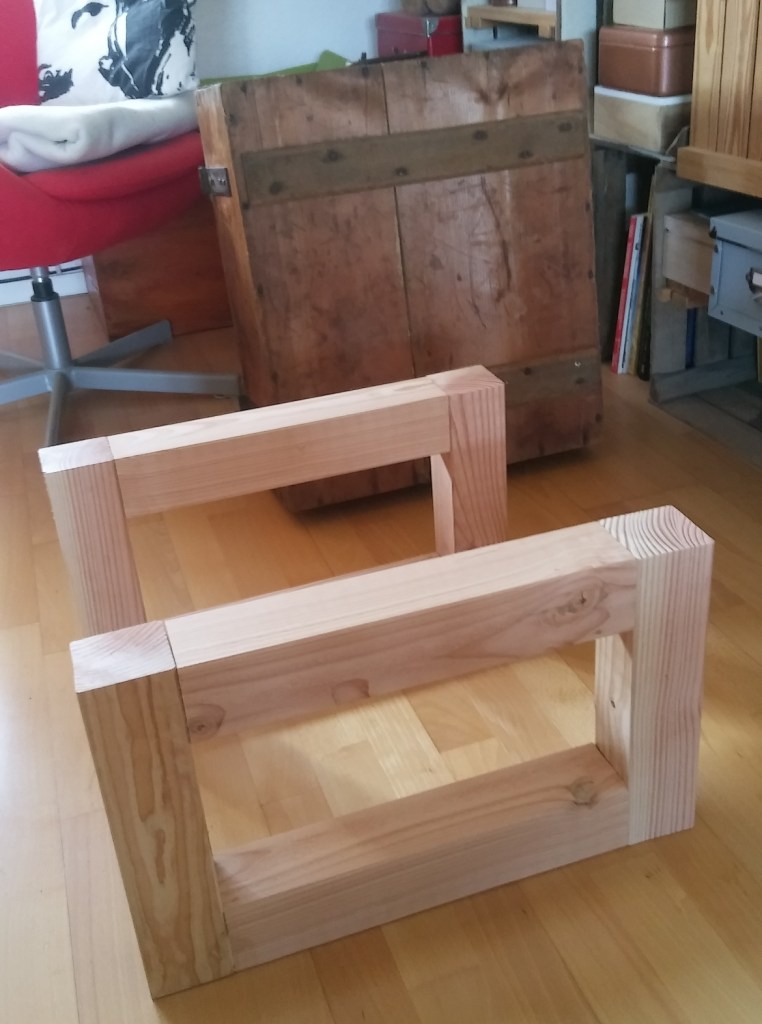 Zum einen habe ich den Bauholzmangel in Deutschland nicht bedacht. Die Balken in 7×7 gab es nur noch in teurer Douglasie, aber gut, wer selber baut spart eben kein Geld, so war das schon immer, und dann sieht das Holz eben ein wenig hochwertiger aus. Zum anderen hatte ich bei einem Balken nicht bedacht, dass das Sägeblatt immer einen Millimeter oder zwei wegnimmt, so dass am Schluss die Beine eben 29,7 cm wurden. Sei’s drum.