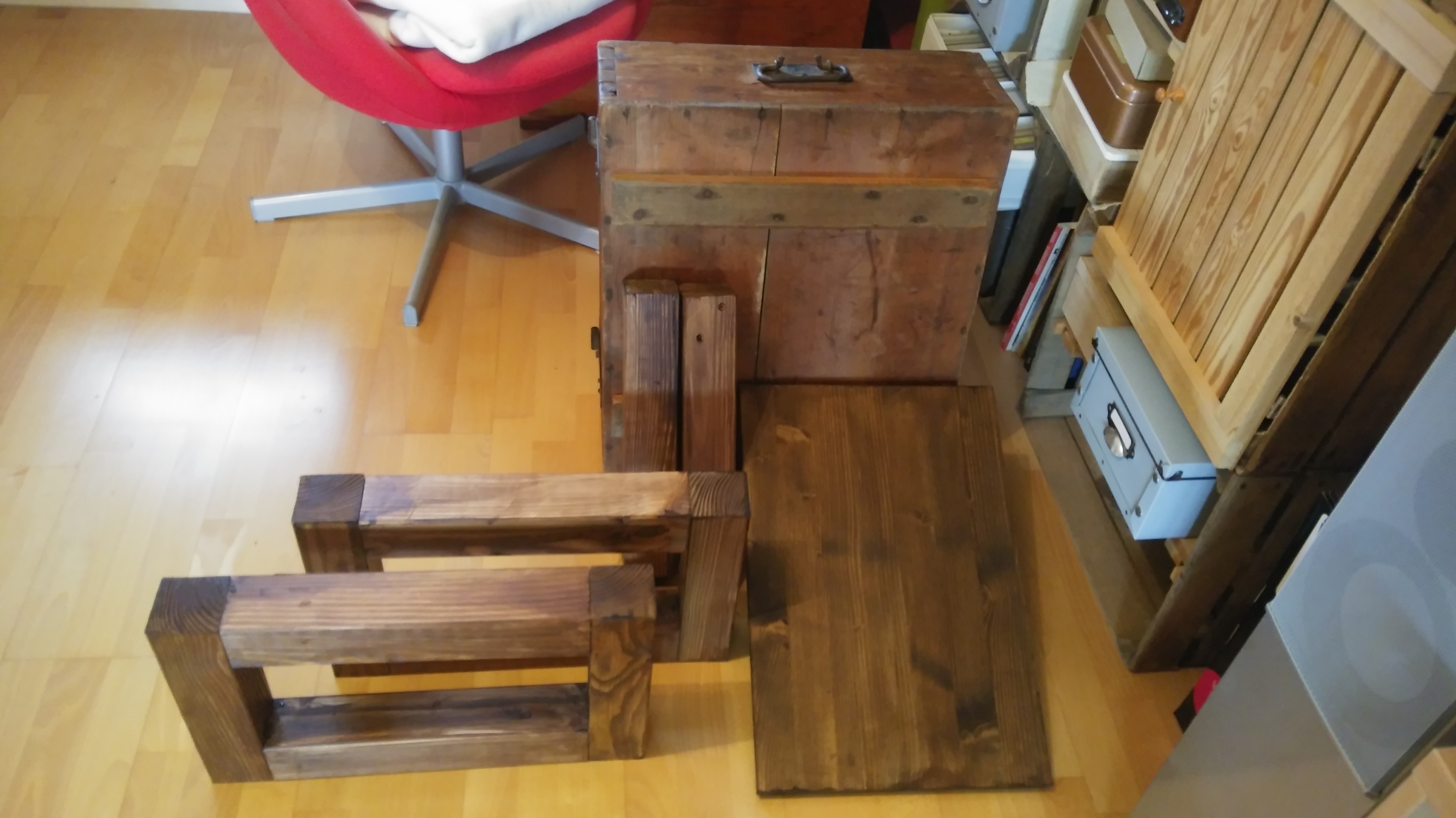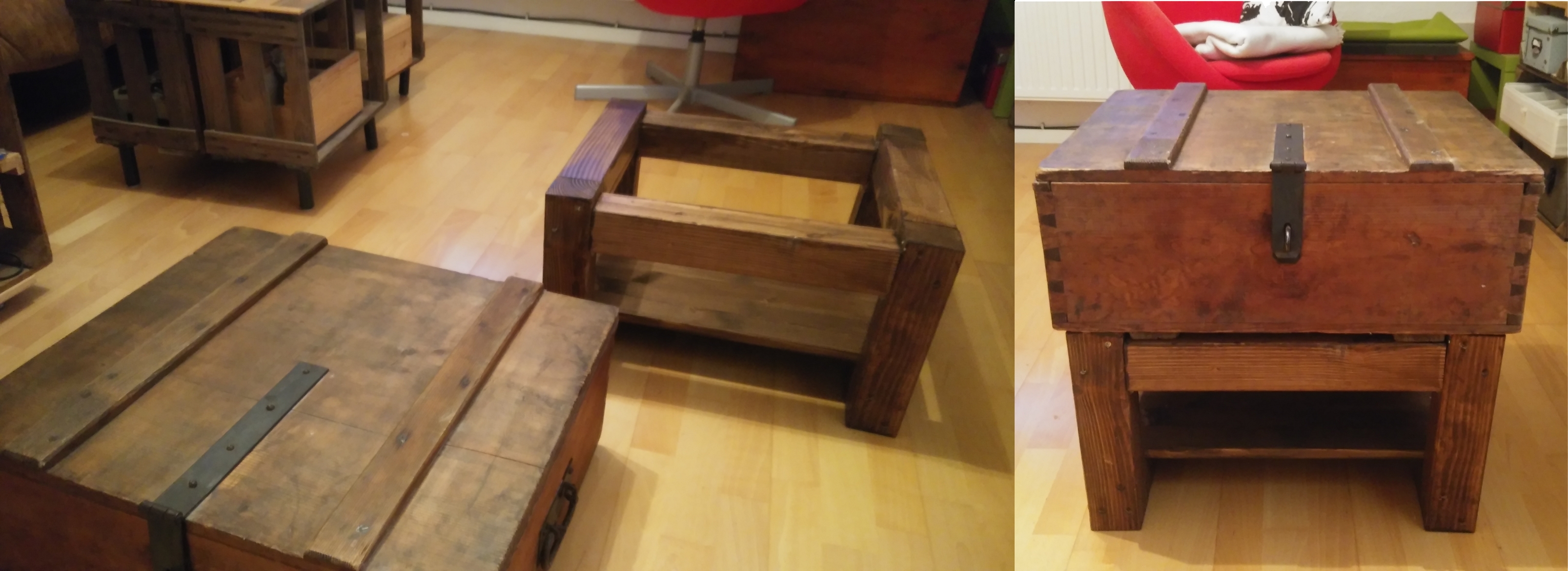 Mit eines der ersten Bastelprojekte in meiner kleinen Wohnung war ein Couchtischchen aus Weinkisten. Das war vor 10 Jahren mal in und die Dinger sind einfach miteinander zu kombinieren. Aber wirklich schön ist das Weinkistenholz nicht und na ja … man sieht sich satt nach ein paar tausend Abenden auf der Couch. Man könnte sich auch von dieser Konstruktion mal verabschieden.
