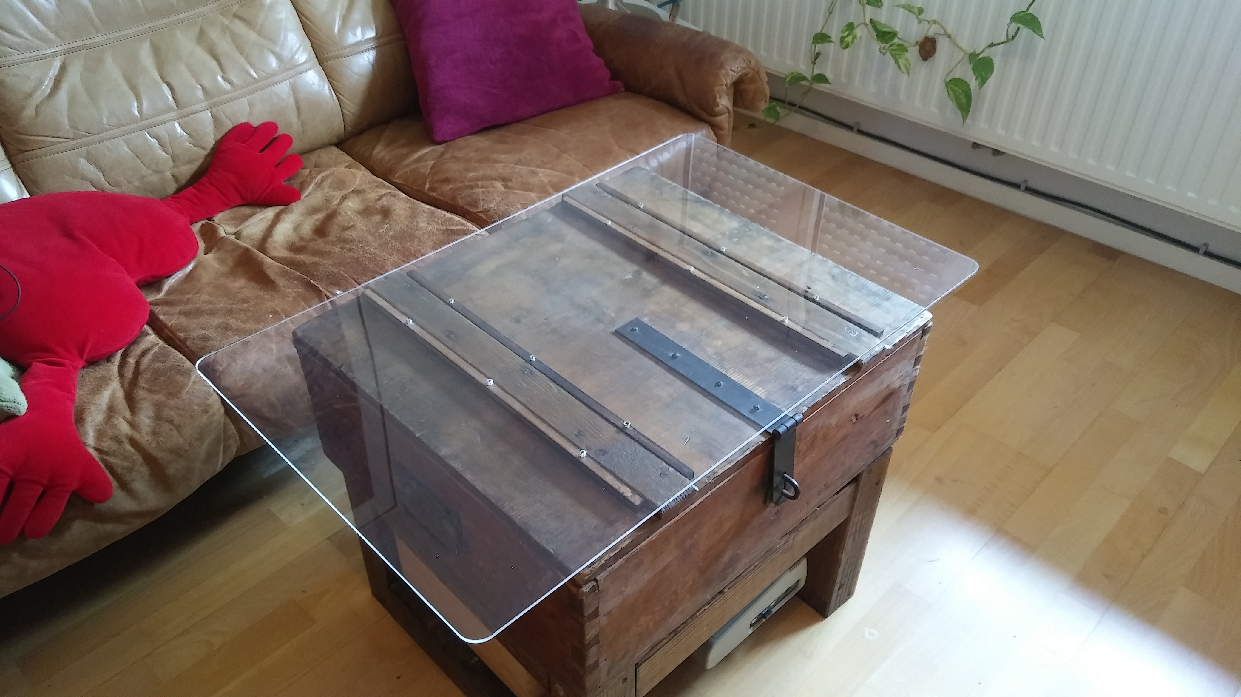 Zugegeben: Die auf Maß gefertigte Plexiglasplatte war mit ca. 50 Euro nun wirklich nicht billig, vor allem wenn man die Kanten brechen lässt und die Ecken abrunden. Aber niemand will sich an einem Couchtisch den Oberschenkel aufreißen, ich auch nicht. An die durchsichtige Platte wurden einfach kleine Leisten geschraubt und zwar so, dass sie eng mit den Querlatten des Deckels abschließen. Das klemmte am Ende so gut, dass ich den Deckel hochklappen kann, ohne dass die Platte ins Rutschen kommt, man kann sie natürlich auch jederzeit abnehmen. In der Kiste selbst ist jede Menge Platz für Geraffel. Die Munition war ja gottseidank nicht mehr drin.