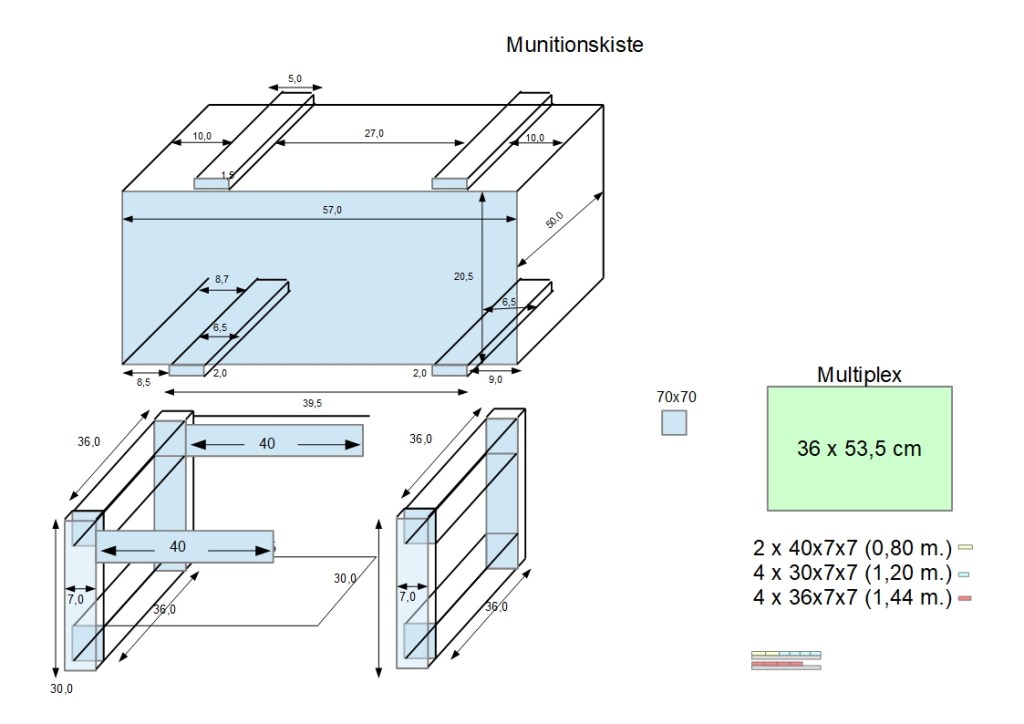 Ist es wirklich eine Munitionskiste aus dieser Zeit? Stempel oder Beschriftungen waren auf dem Ding nicht zu entdecken. Die Familienlegende sagt allerdings klar ja. Sie stand früher auf der Bühne (für alle Preußen: dem Dachboden) und war da schon immer, der Opa, der im Krieg Lokomotive gefahren ist, hat das so erzählt (mein Uropa, nie kennengelernt) und deswegen werde das schon so sein. Ein Faktencheck im Internet bringt nicht viel hervor. Es gibt wenig Fotos von originalen deutschen Munitionskisten im Netz, die wenigen, die man findet, offenbaren eine gewisse Vielfalt an Formen und Bauweisen. Vermutlich machte das jede Patronenfabrik irgendwie nach Hausrezept. Von der prinzipiellen (ziemlich stabilen) Bauweise und vom Stil der Beschläge her könnte es jedenfalls sein, und wenn es mit der mündlich tradierten Provenienz zusammen geht – von mir aus.