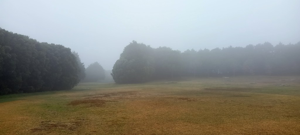 Vor allem ist hier ein großer Parkplatz, aber hey, der Park ist schön. Auch wenn alles in dichten Nebel gehüllt ist. Ich kenne diesen portugiesischen Küstennebel, 2019 hatte ich eine schwierige Hafenansteuerung vor der nordportugiesischen Küste in dieser Suppe. Aber der Park wirkt im Nebel wie verzaubert. Es gibt freilaufende Hühner, fast ohne Scheu. Englische Landsschaftsgärtnerei, große Flächen mit Bäumen, ein Amphittheater. Dann rauscht dahinter das Meer.
