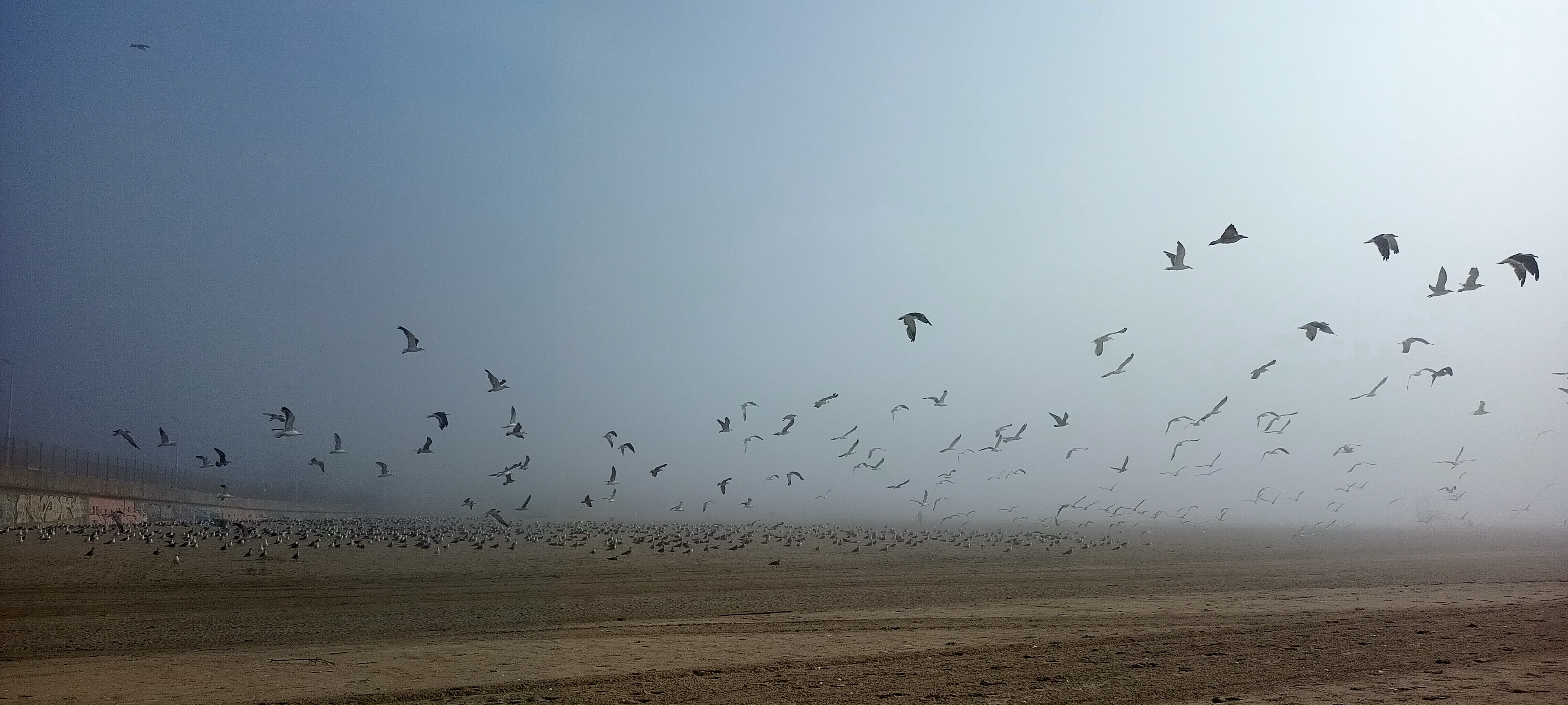 Es ist Ebbe. Es ist Nebel. Es muss ein Surferhotspot sein, eine Gruppe Kinder macht mit einem Lehrer Trockenübungen im Dampf. Man sieht nicht weit und die nasse Sandfläche ist flach und riesig. Ich laufe mit nackten Füßen durch den feuchten Sand und hänge die Zehen in die kalte Brandungslinie. Die wenigen anderen Menschen hier sind undeutliche, verschwommene Gestalten. Der Nebel malt alles weich, er gleicht auch die Farben aneinander an und macht aus dem Strand eine mystische kleine Märchenwelt. Caspar David Friedrich hätte das gemalt. Heine gleich noch ein weiterens Meer-Gedicht geschrieben. Eine kleine Bar hat schon auf. Ich bin der einzige Gast.