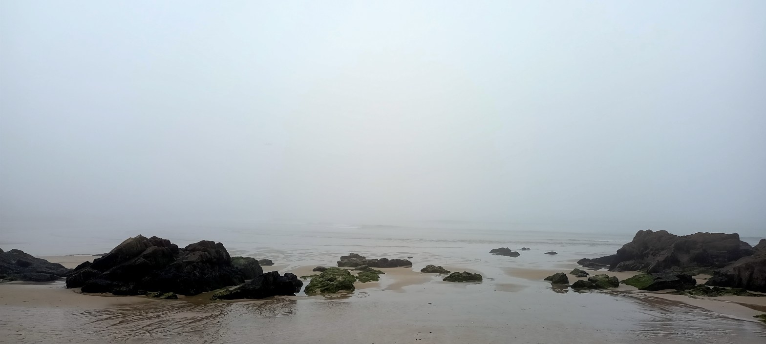 Es ist Ebbe. Es ist Nebel. Es muss ein Surferhotspot sein, eine Gruppe Kinder macht mit einem Lehrer Trockenübungen im Dampf. Man sieht nicht weit und die nasse Sandfläche ist flach und riesig. Ich laufe mit nackten Füßen durch den feuchten Sand und hänge die Zehen in die kalte Brandungslinie. Die wenigen anderen Menschen hier sind undeutliche, verschwommene Gestalten. Der Nebel malt alles weich, er gleicht auch die Farben aneinander an und macht aus dem Strand eine mystische kleine Märchenwelt. Caspar David Friedrich hätte das gemalt. Heine gleich noch ein weiterens Meer-Gedicht geschrieben. Eine kleine Bar hat schon auf. Ich bin der einzige Gast.