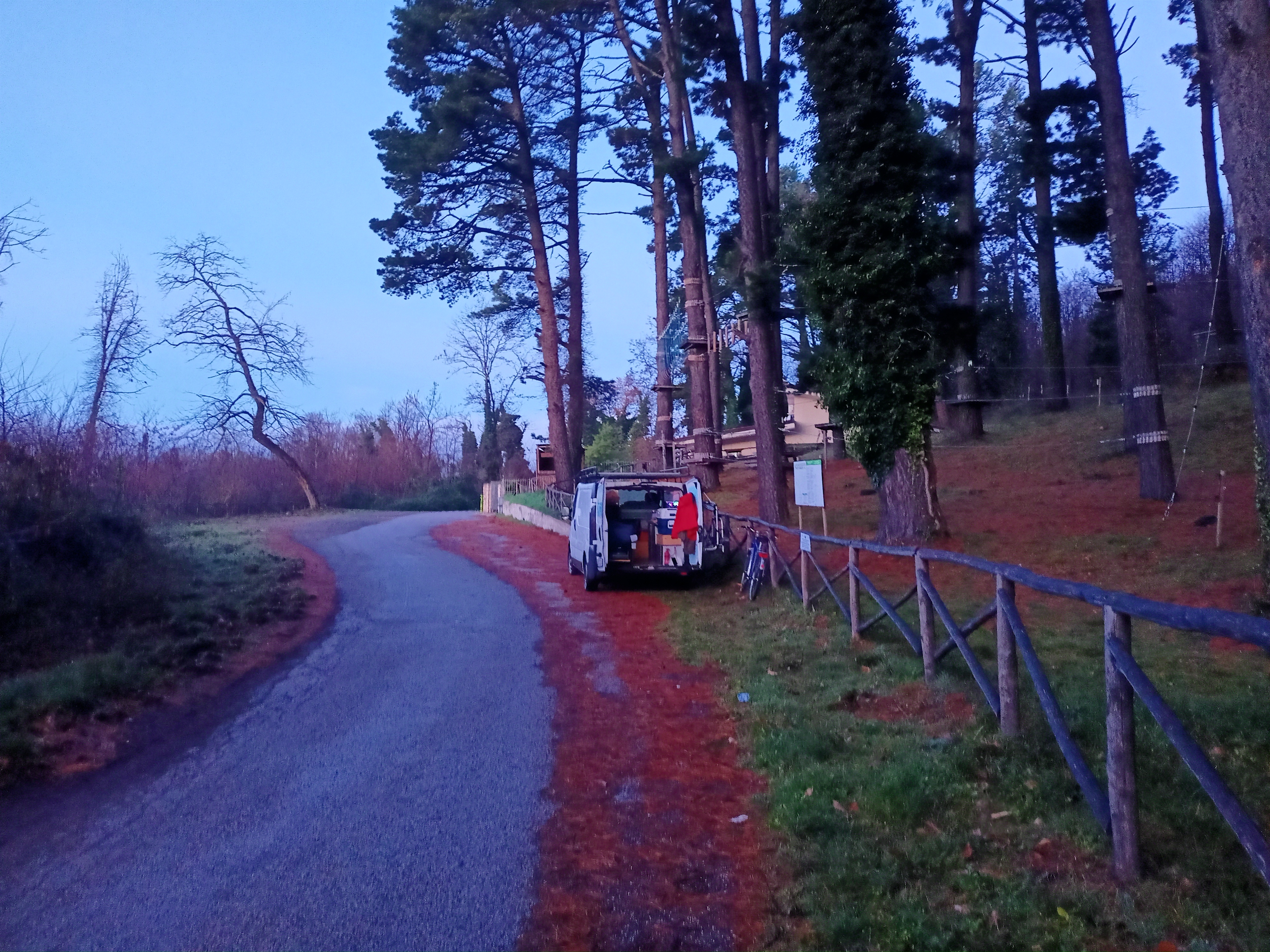 Als der Morgen dämmert klären sich die Dinge. Tatsächlich befindet sich rechterhand eine ziemlich große Picknickwiese unter Bäumen mit Kletterpark. Der Wald ist gar nicht so dicht. Und der Werwolf von Tarker Mills ist ein Rudel streunender Hunde. Sie sind gar nicht mal so bedrohlich. Im Lauf des Morgens sehe ich drei von Ihnen und der größte geht mir bis zum Knie. Sie sind sehr vorsichtig mit gegenüber, aber neugierig. Einer macht sich, als ich im Bus bin, über das draußen abgestellte Kochgeschirr vom gestrigen Abend her und leckt Öltropfen aus der Pfanne. Er tut mir leid und ich wünschte, ich hätte was Besseres für einen Hund dabei, als die Ausstattung eines reisenden Vegetariers,