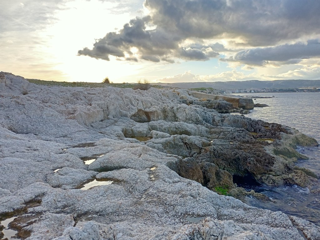 Ich lande letztendlich an diesem Nachmittag auf Thapsos, einer kleinen Halbinsel nördlich von Syrakus. Die ganze Ecke scheint komplett Eni-Oil zu gehören, das sind die Tankstellen mit dem schwarzen Hundevieh auf gelb. Hier ist ein großer Strandparkplatz und eine bronzezeitliche Nekropole. Eigentlich war die Halbinsel ein großer Handelsplatz der sehr frühen Mittelmeer-Zivilisationen, aber vor allem sind heute die Felsengräber, direkt in die raue Küste gehauen, heute noch sichtbar. Mindestens genau so spannend allerdings finde ich die Luftabwehr-Batterie aus dem Zweiten Weltkrieg, über die ich mehr zufällig direkt neben den bronzezeitlichen Relikten stoße. Eine ziemlich umfangreiche Abwehrstellung, ich zähle mindestens 8 Stände für große Geschütze.