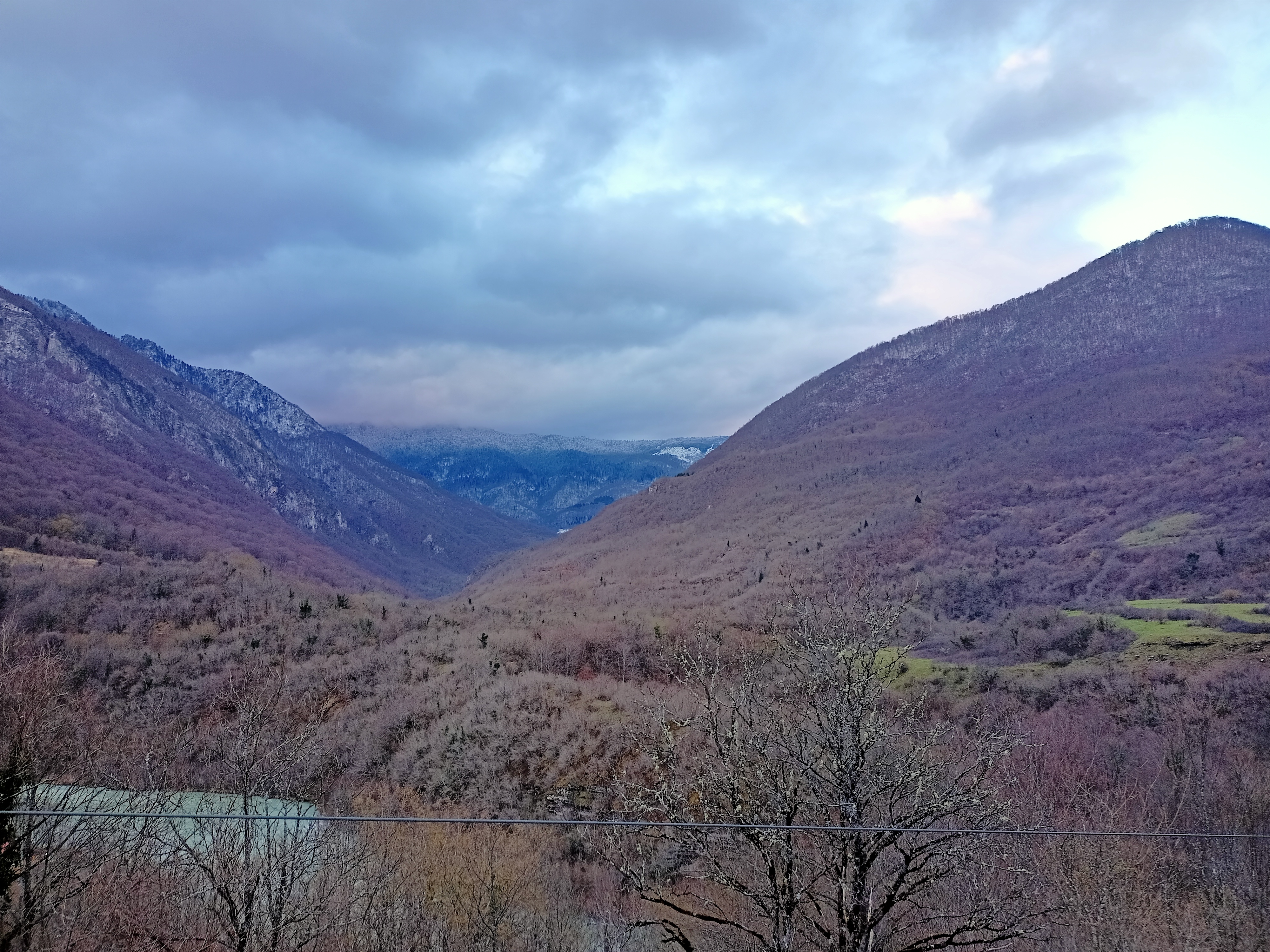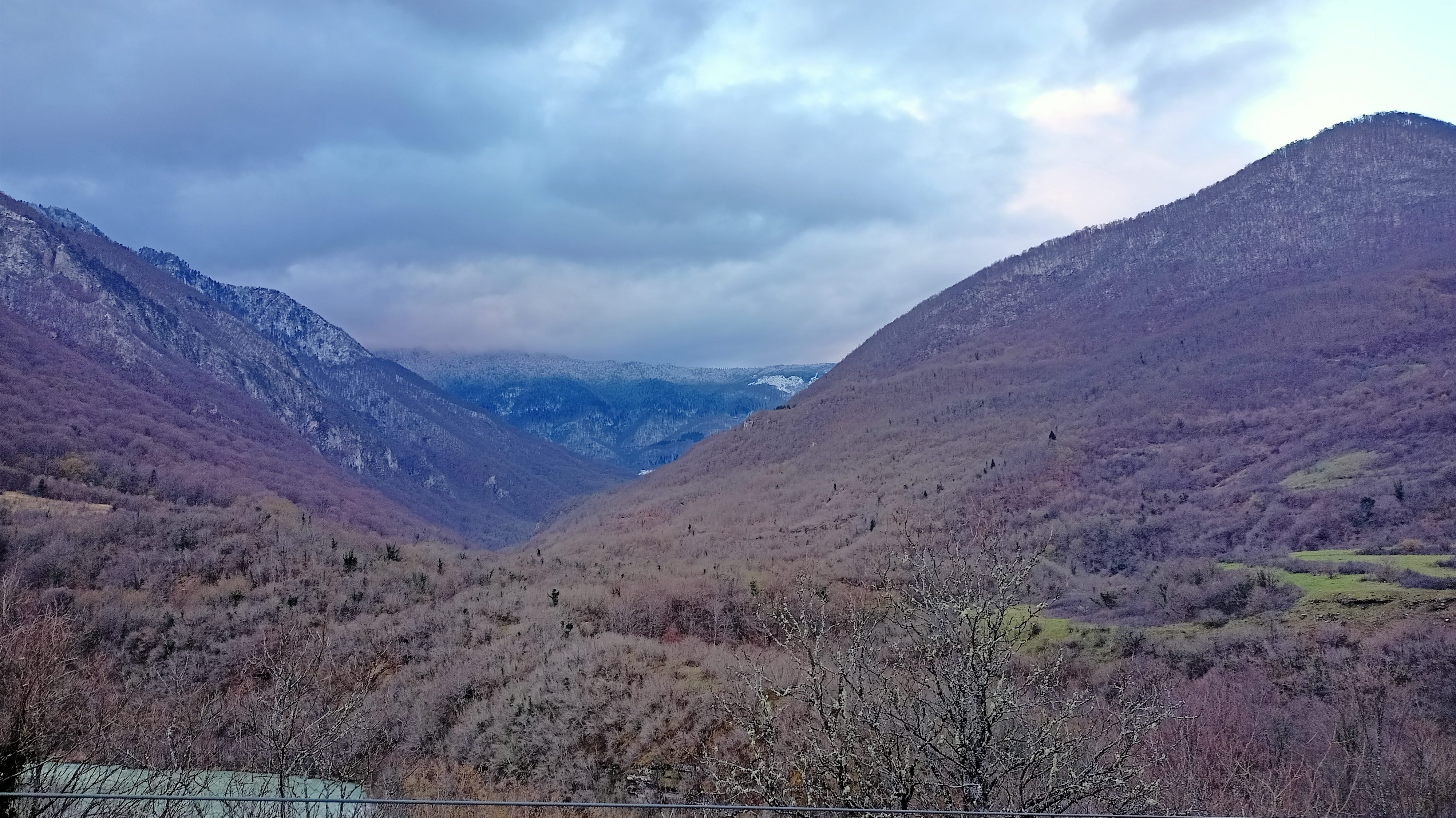 Die Straße auf der anderen Seite ist viiieeeel besser. Gefördert mit EU-Geldern, und wieder muss ich sagen: Was hat die EU da nicht schon wieder Gutes für mich geleistet. Ich kann relativ normal fahren. Abgesehen von der völlig abgefahrenen Schluchtenlandschaft, diesmal nicht Winnetou, sondern reinste Tolkien-Illustration. Felstürme, Brücken, immer wieder Tunnel, darunter ein eisblauer Fluss. Die Sonne kommt heraus. Ich kriege den Mund nicht mehr zu über diese Landschaft, die sich allmählich in ein breites Flusstal öffnet. Der Schnee kriegt mich auf einer Hochebene – sieht sehr nach Schweiz aus – doch noch, aber schönerweise ist es ein sehr trockener, pulvriger Schnee, den Gaspard ohne Probleme bewältigt. Ab und zu rütteln Windböen am Bus.