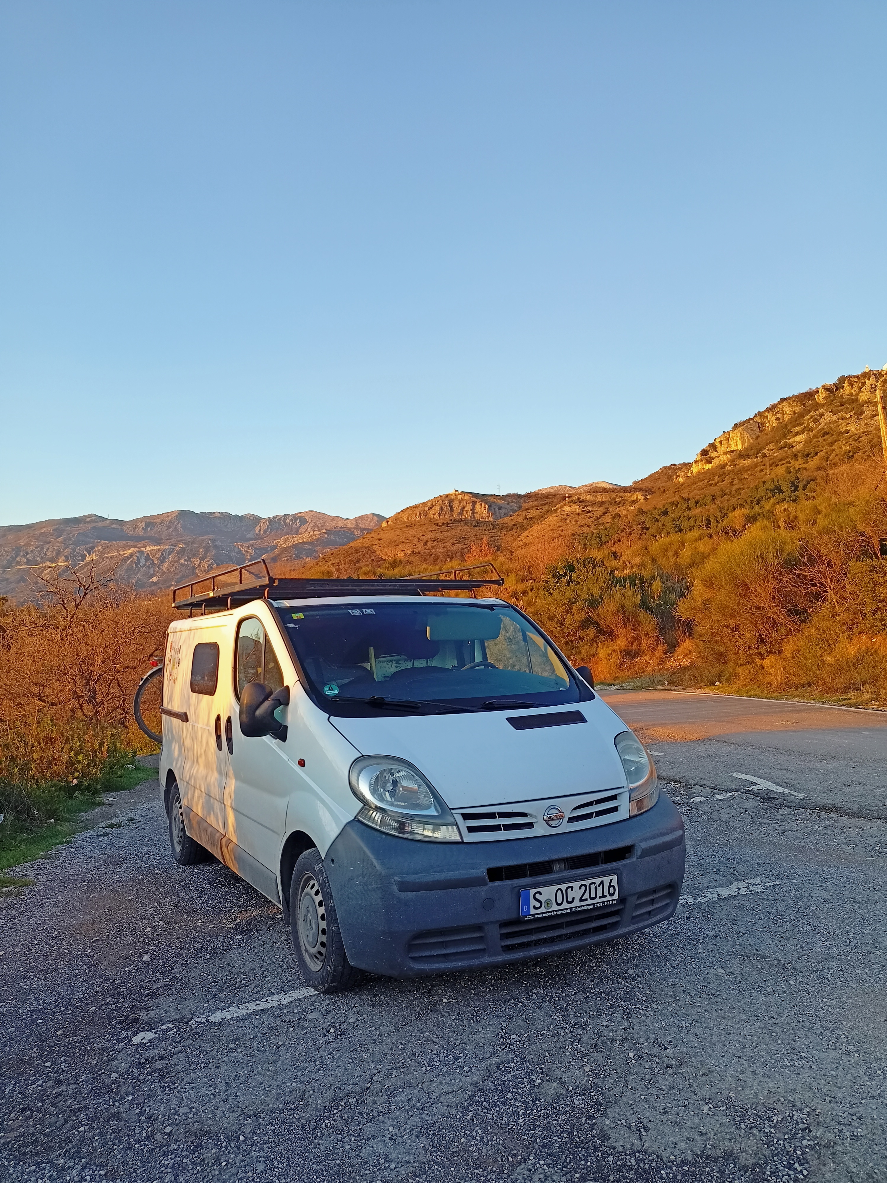 Ich erwache beim ersten Vogelzwitschern weil es kühl an den Schultern in den Schlafsack zieht. Es ist definitv kalt im Bus. Einmal herumgedreht und das Frühlicht ist da. Jetzt sehe ich endlich meine Umgebung und über mir ragen riesige, zerklüftete Felswände. Der Fluss schäumt. Ein gigantischer Campingplatz liegt unter mir im Winterschlaf.