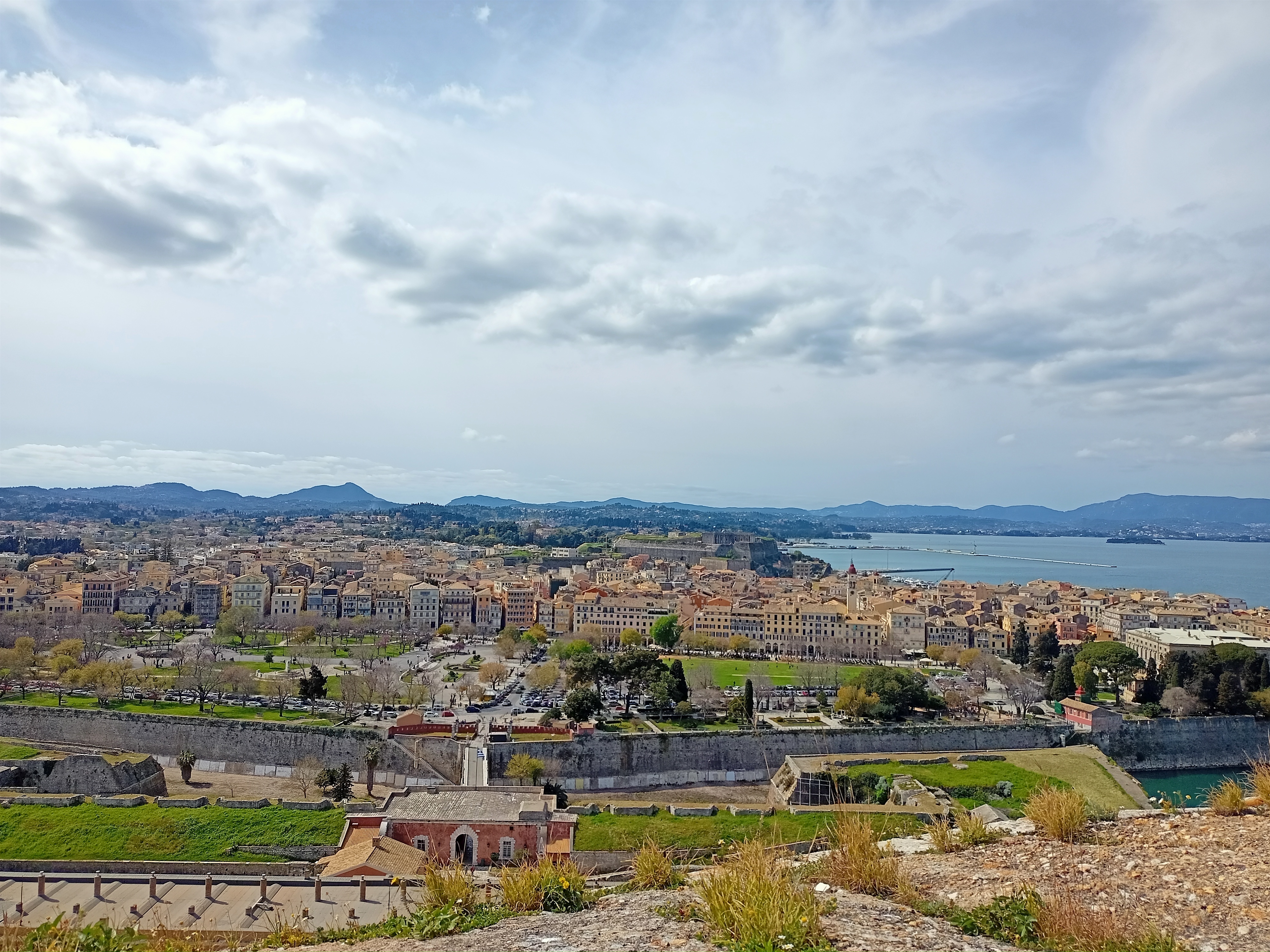 Am Samstag ist hier viel los und man kann ganz nett durch enge Gässchen schlendern. Bzw. ein Fahrrad schieben. Am Ende lande ich auf der bombastischen Hafenfestung. Alle haben hier dran gebaut. Die ersten Korfuer haben komplett auf den beiden Felsen gesiedelt, dann kamen die Byzantiner, die Venezianer, danach die Osmanen und am Ende noch die Briten und alle haben an die Festung was ran oder umgebaut.