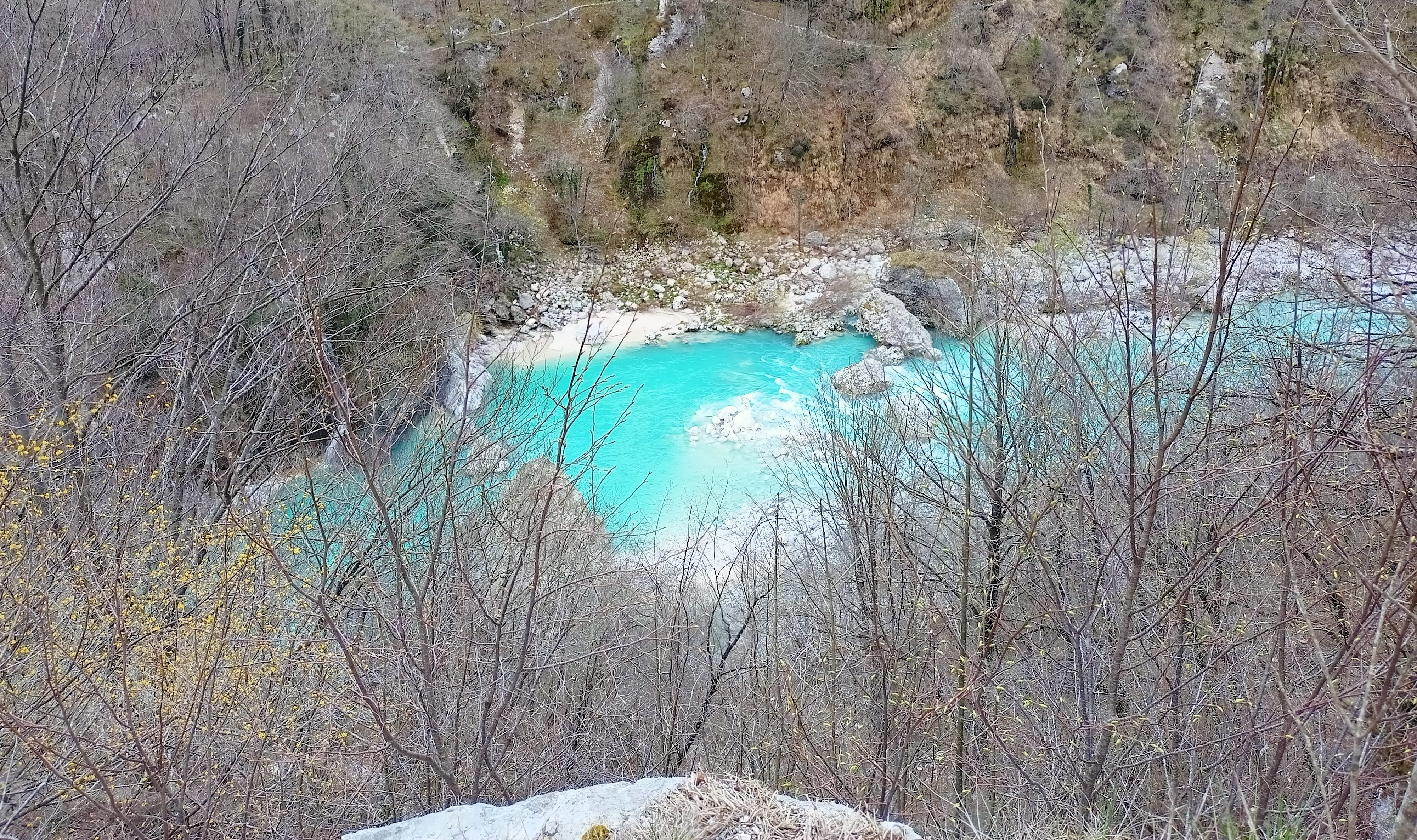 Gegen Abend fahre ich noch eine Stunde raus ins Soca-/Isonzo-Tal. Steile Schluchten, tiefe Klüfte, irrsinnig blaues Wasser im FLuss. Irre, aber auch eng und einsame Dörfer. Wieder ein Parkplatz. Mann, heute ist ganz schön viel passiert.
