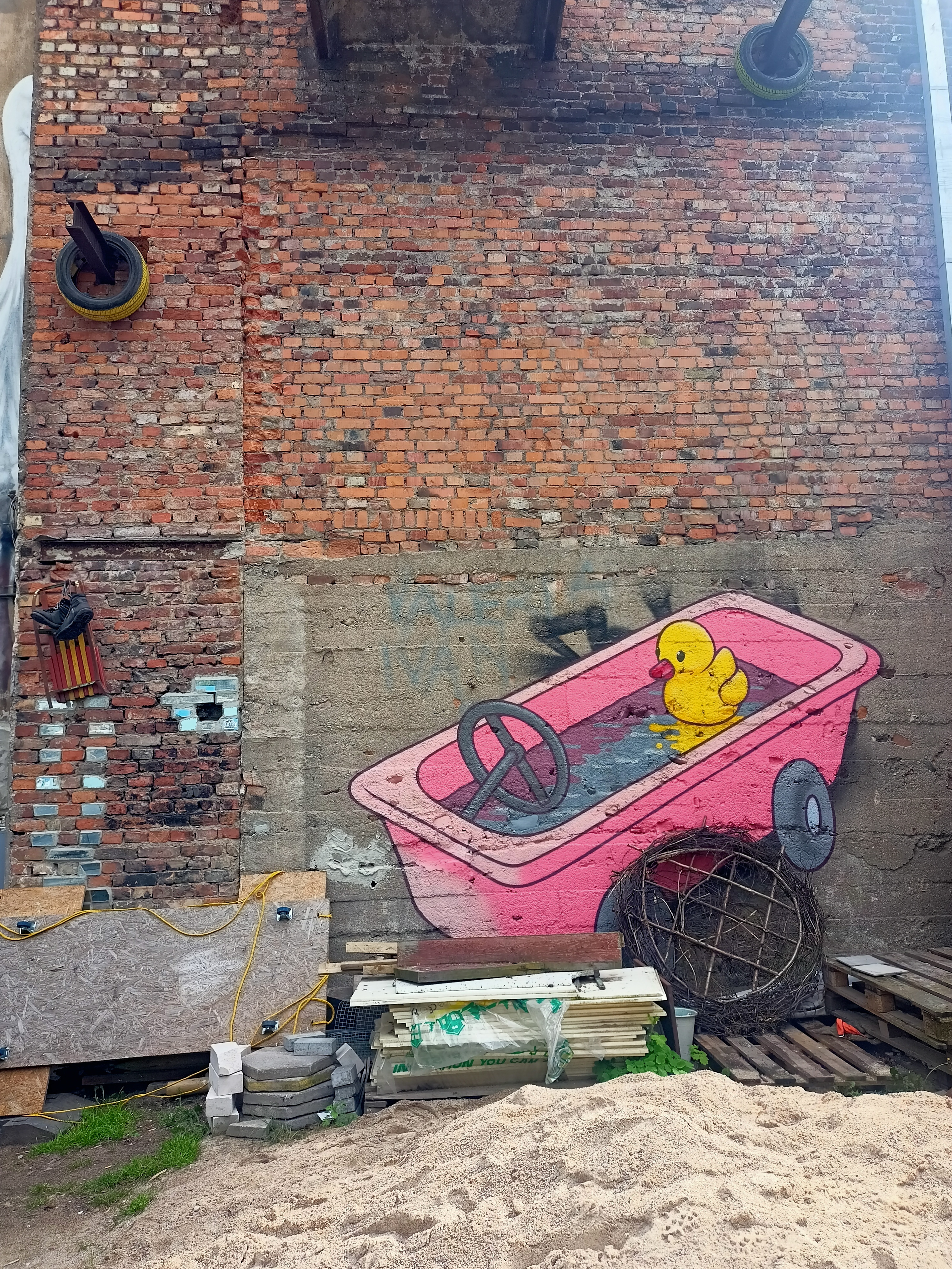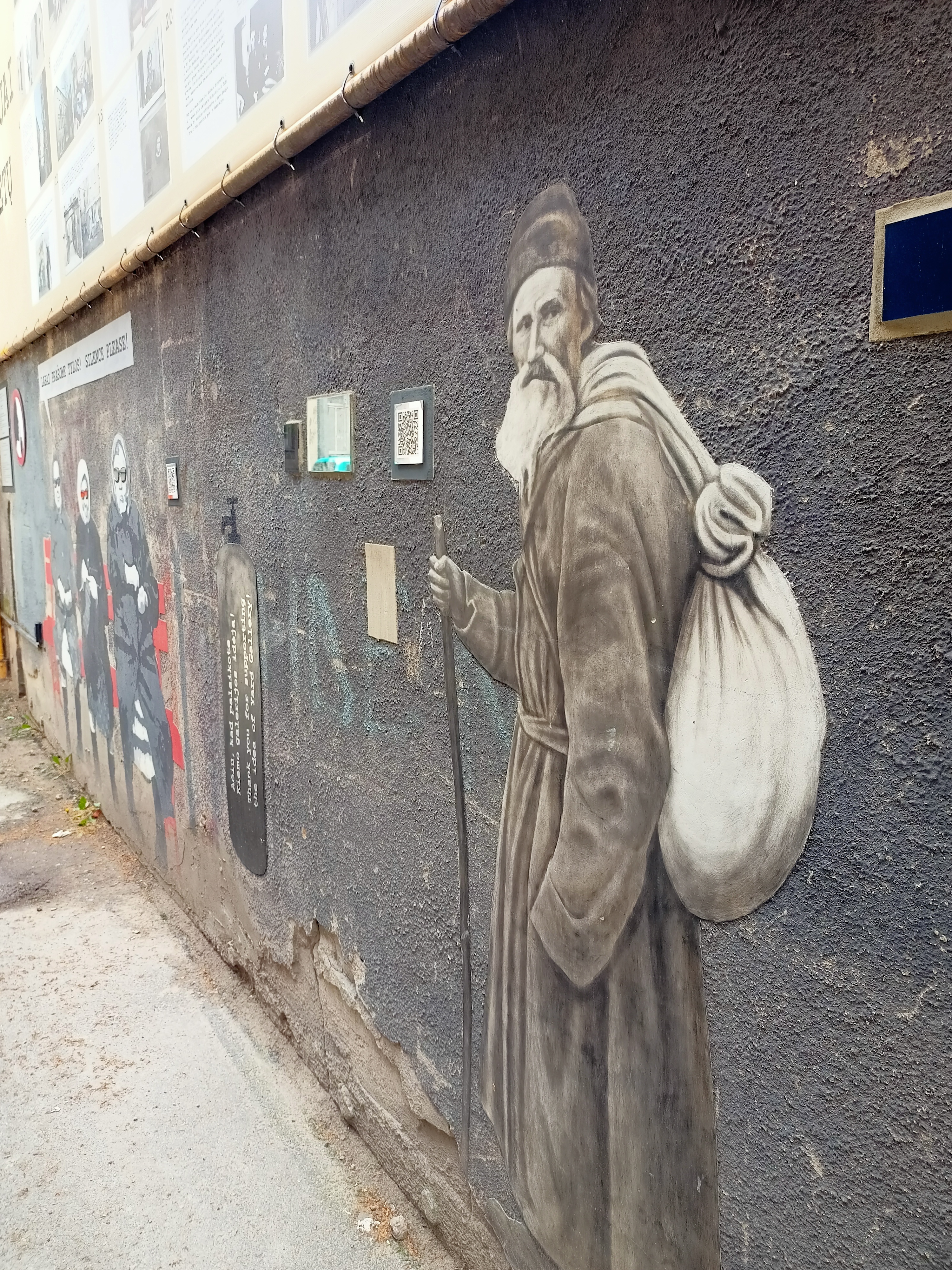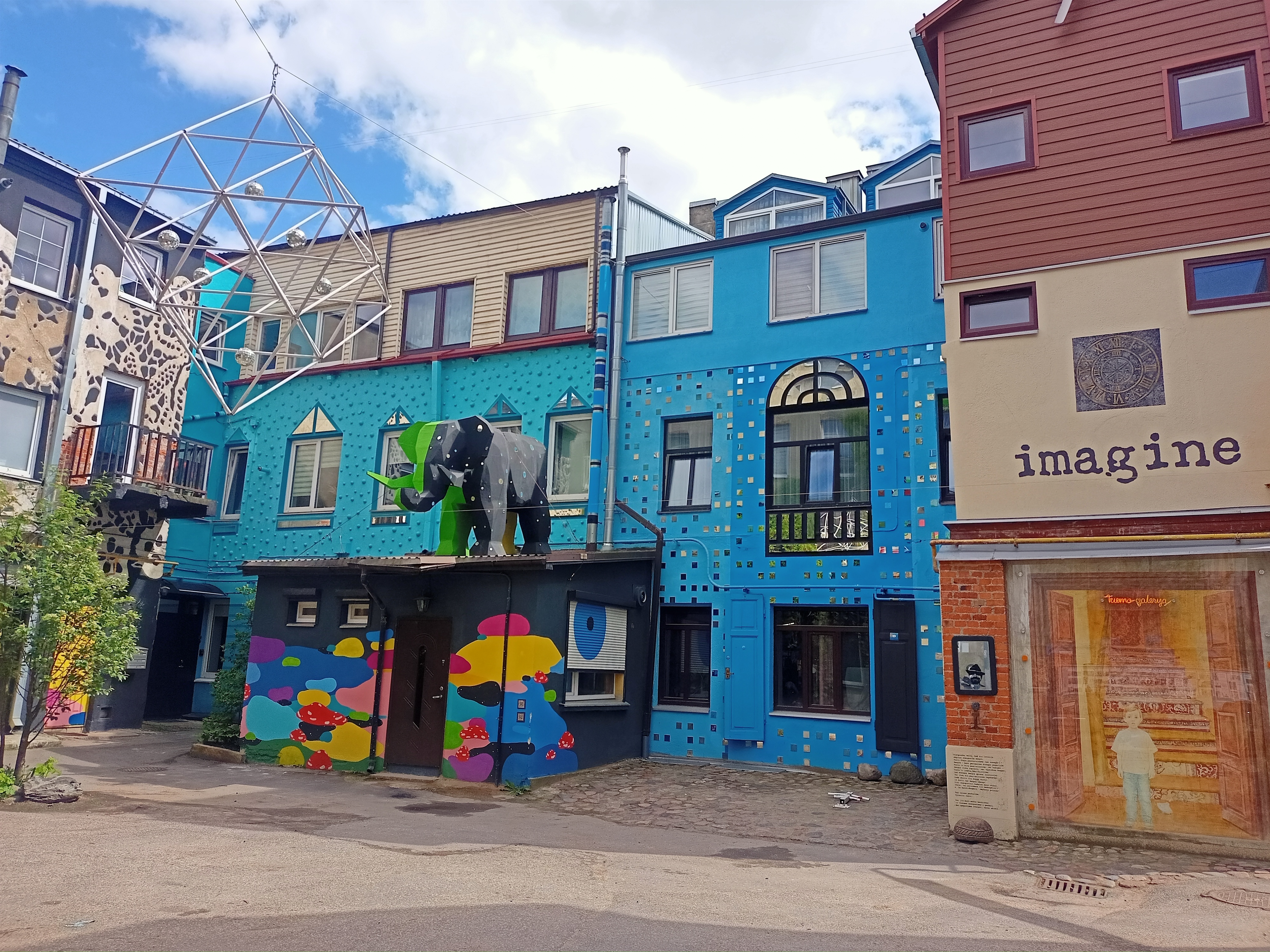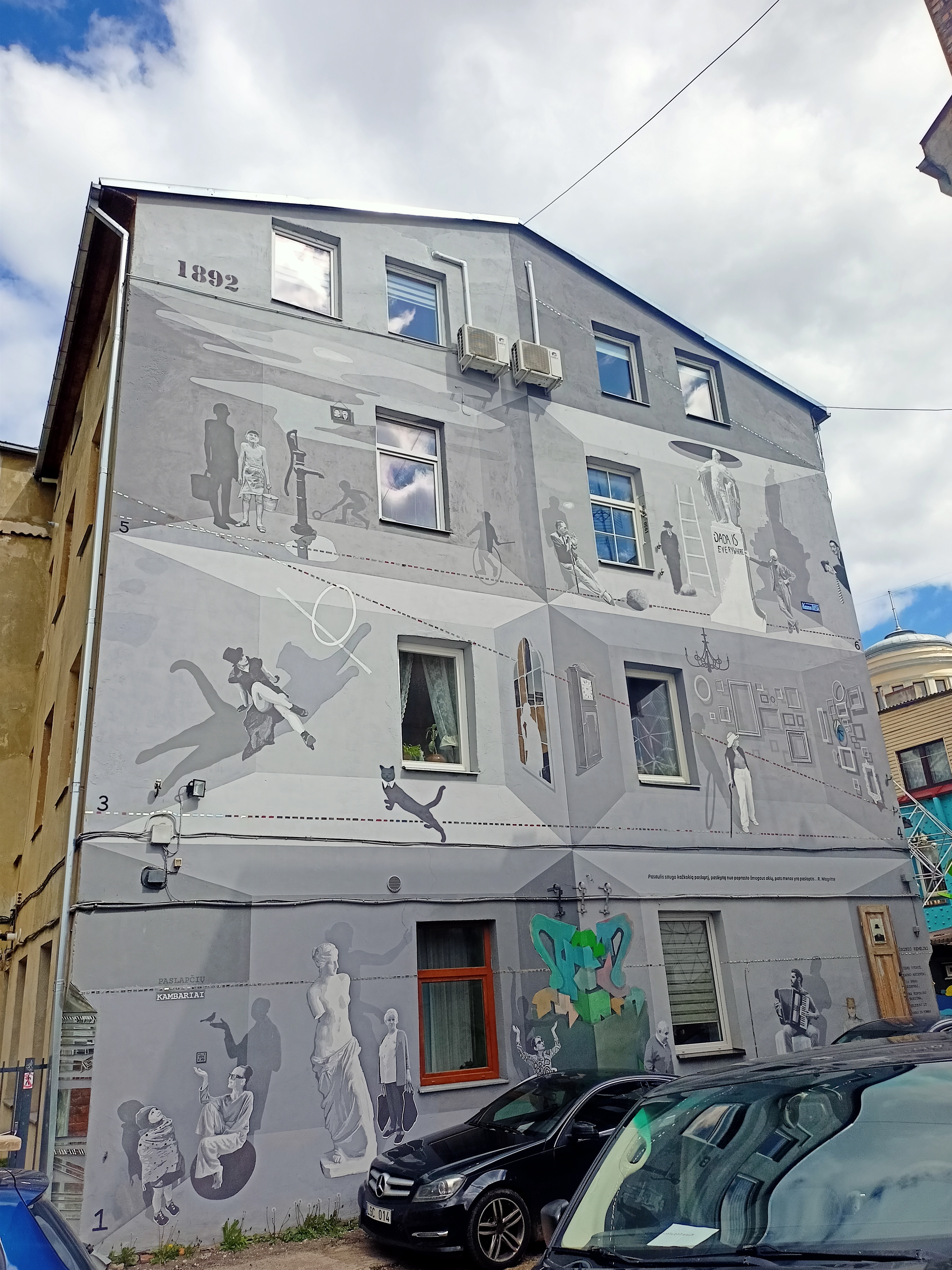 Dahinter ist gleich die Yard-Gallery. Modernität. Kaunas ist nämlich auch ein Street-Art-Zentrum, man kann Murals quasi überall entdecken. In der besagten Yard-Gallery, ein ehemals ganz normaler Wohn-Hinterhof, ist so eine Art Nukleus der Street Art Bewegung in Kaunas. Das Projekt begann um einerseits die in der Moderne entfremdet von einander lebenden Bewohner der Häuser um den Hof in Kontakt zu bringen. Andererseits wird der im Krieg ermordeten jüdischen Bewohner der Häuser mit Murals gedacht. Das Ganze schwankt so elegtant zwischen Augenzwinkern und Ernst, dass man sich einfach in den Hinterhof verlieben muss. Eindrücke: