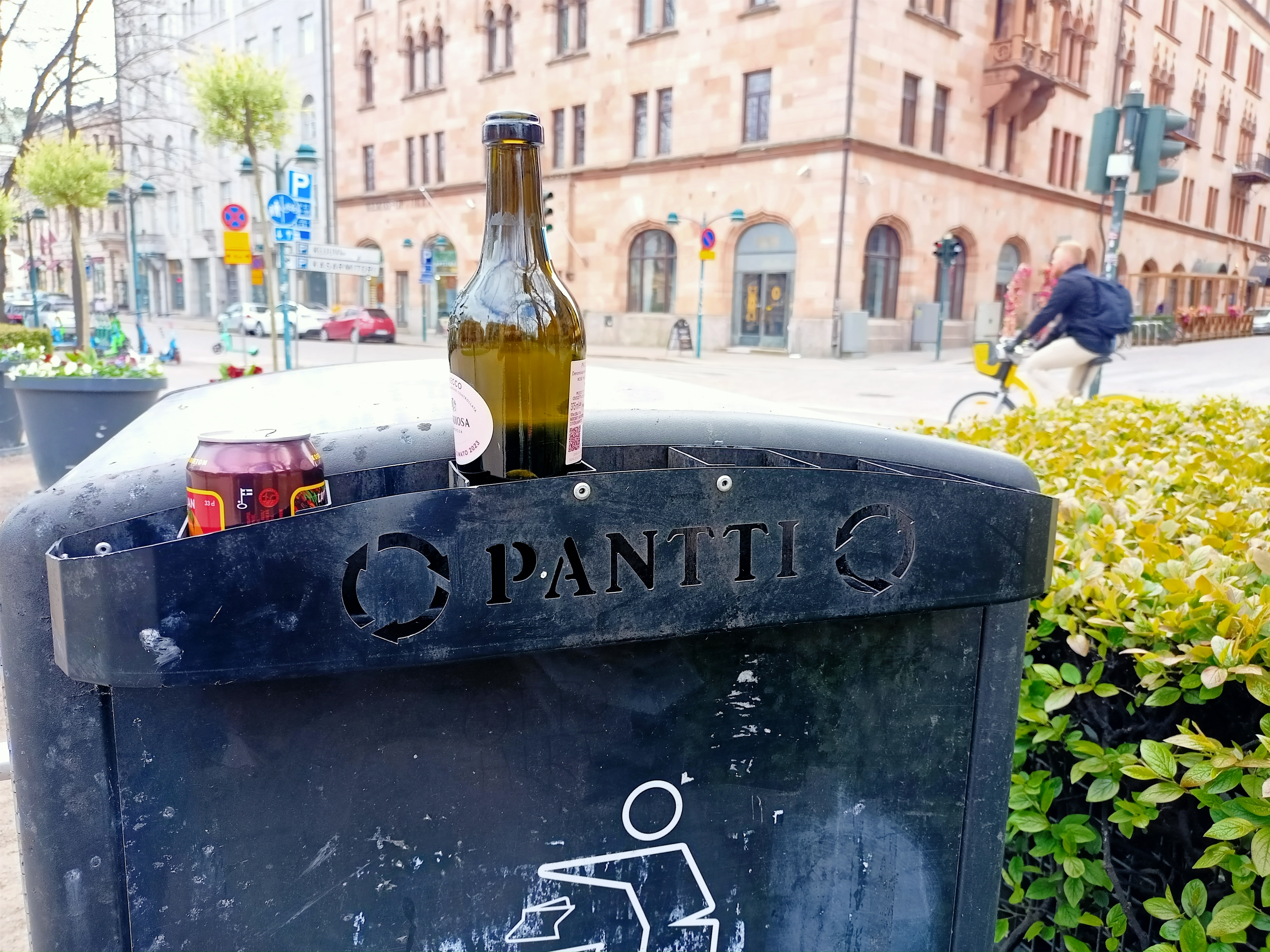 Mülleimer mit extra Pfandregal für die Sammler. Menschenwürdige Stadtarchitektur.