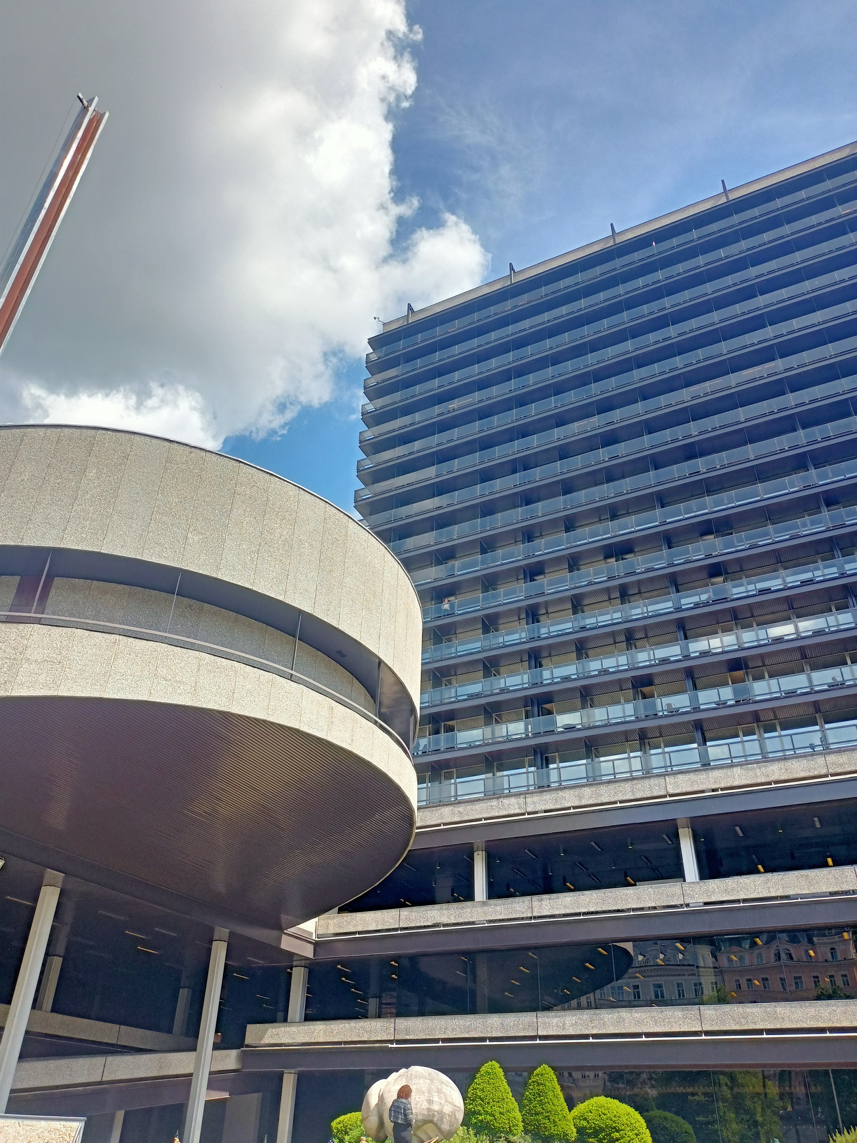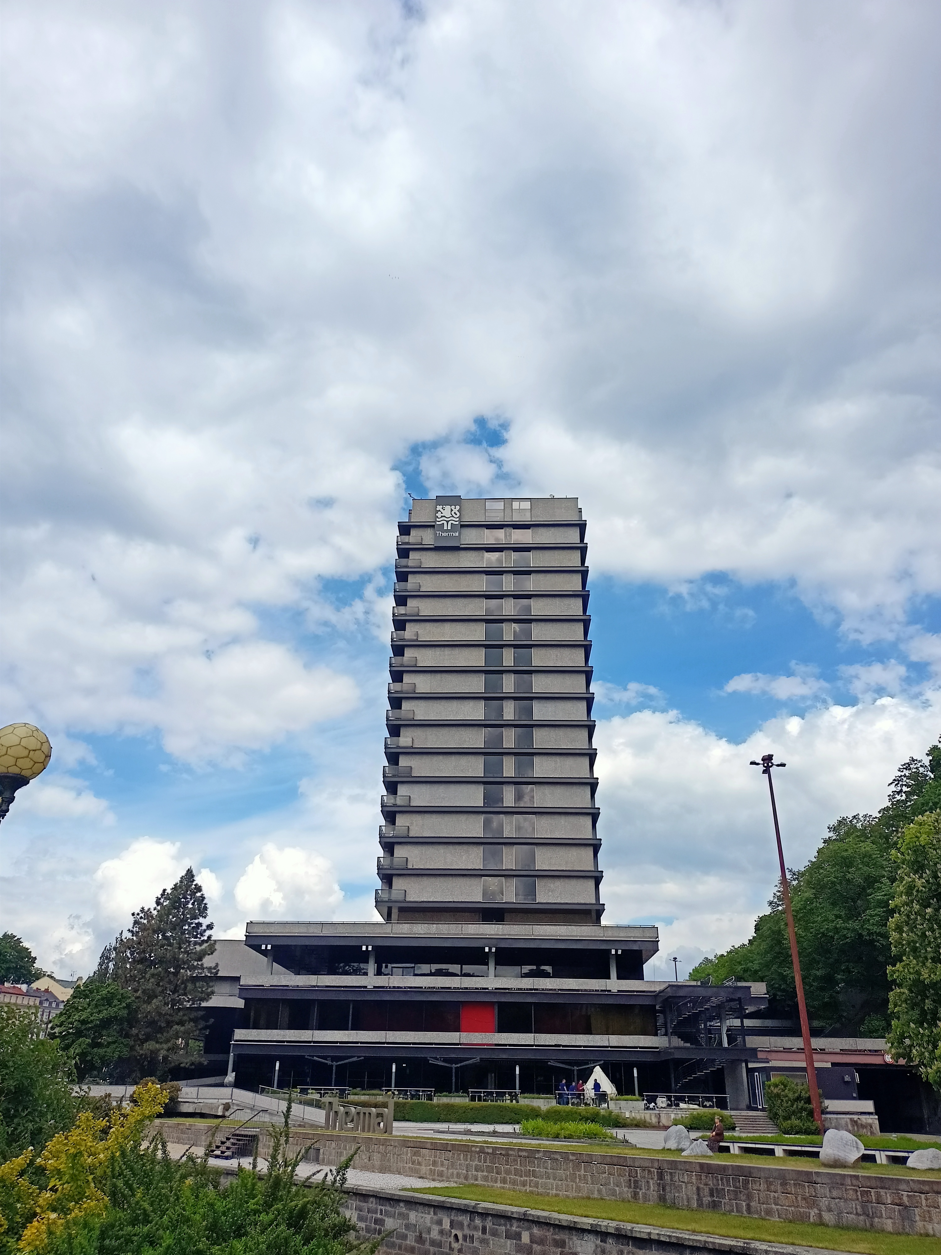 Ein kommunistisches Großhotel aus den 60er Jahren, das ein betongewordenes Ausrufezeichen in die Konditorei-Architektur der Belle Epoque klatscht. Viele Besuchende mögen das Thermal seither als „hässlichen Klotz“ bezeichnet haben, ich empfinde die großen geschwungenen Formen und Fensterflächen des brutalistischen Baus als echte Offenbarung zwischen all dem Pastell-Nippes.