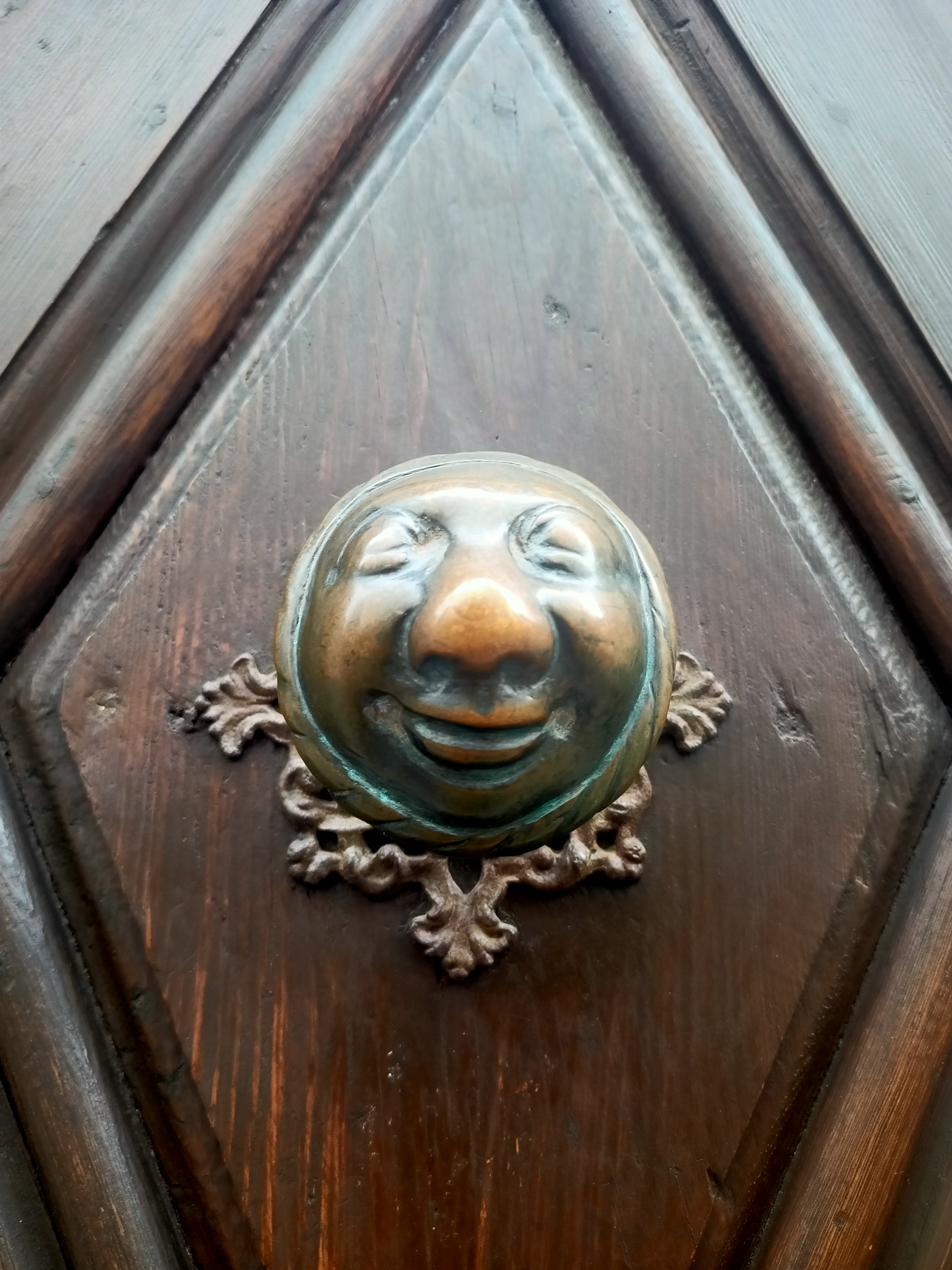Es gibt in Bamberg einen echten Türknauf, der Hoffmann wahrscheinlich zu der Idee inspirierte. Das Original ist längst im Museum aber an der Tür des Hauses hängt eine Kopie. Sie wirkt eigentlich ganz freundlich, als ich sie nach einer Google-Suche endlich finde, aber ich begrüße sie trotzdem sehr höflich und fasse sie nicht an, man weiß ja nie. Hier ist sie: