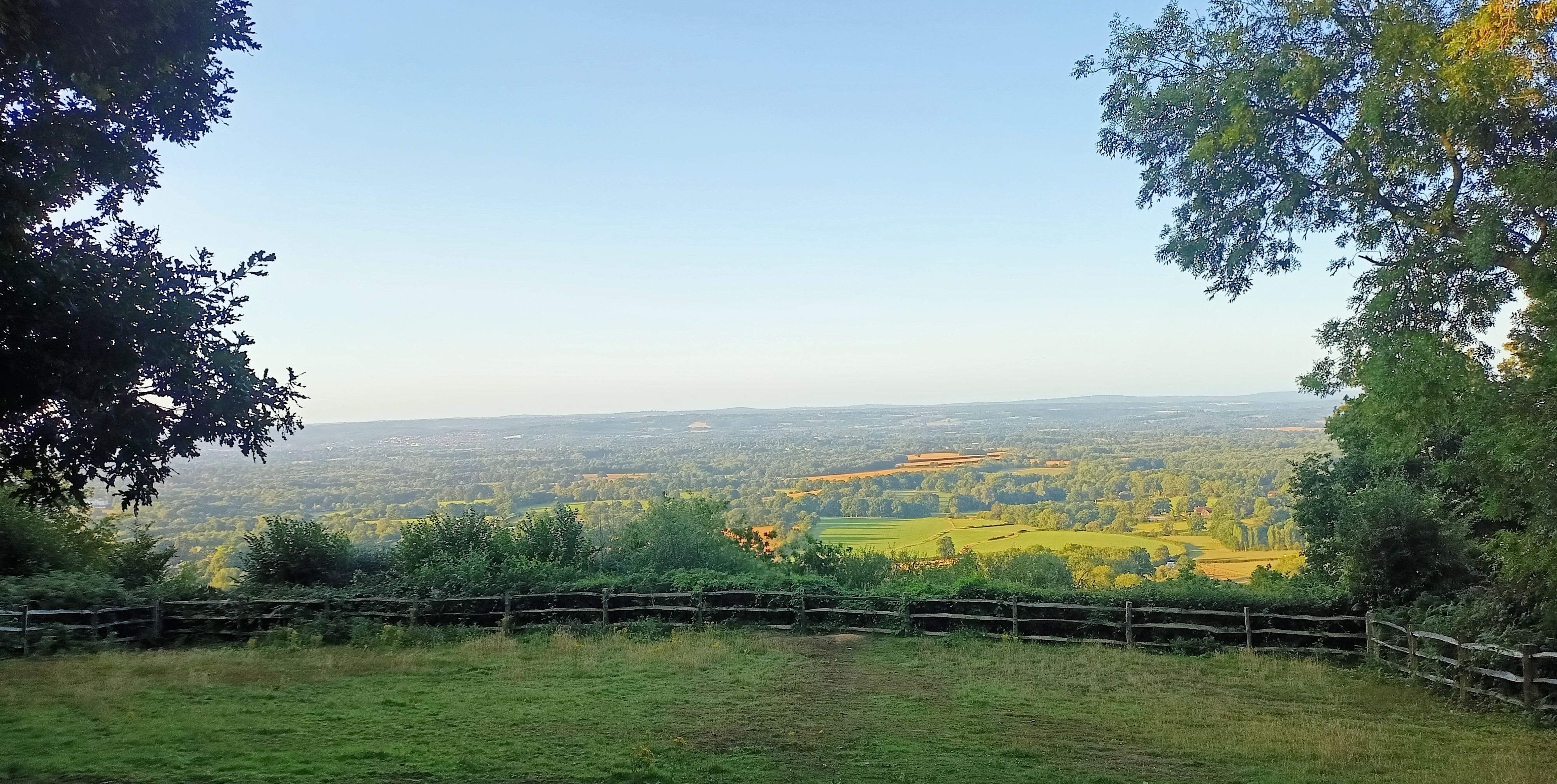 Ich parke am Fuß eines sagen wir mal Landschaftschutzgebiets namens „One Tree Hill“ südlich von Sevenoaks. Alleine diese Namen klingen nach Karte im Umschlag eines Fantasy-Romans, und als ich mich zum morgendlichen Spaziergang durch den Waldhügel aufmache, mutet mir das ganze schon sehr nach Tolkien oder Merlinsage an. Als der Hügel 1911 für die Öffentlichkeit erworben wurde, mag wohl ein einzelner alter Baum auf seinem Gipfel gestanden haben, heutzutage sind es ein paar Dutzend, aber sie sind tatsächlich sehr alt und groß und es eröffnet sich von da aus dieser Blick über die südenglische Landschaft: