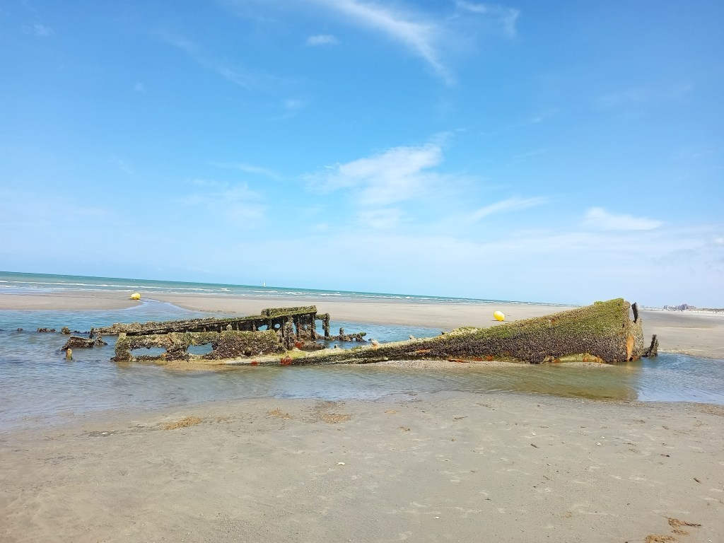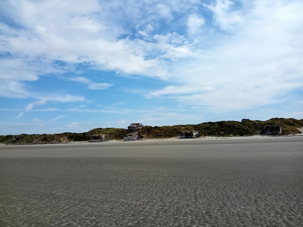 Es werden nun echt Erinnerungen an den Anfang meines Jahres wach, denn es begann auch alles quasi mit einem Barfußspaziergang über einen wahnsinnig breiten Weltkriegsstrand. Damals konnte ich mein Glück kaum fassen, weil dieses Jahr vor mir lag, jetzt schließt sich der Kreis und es ist alles ein bisschen von Abschied geprägt. Der Wind dreht auf dem Strand völlig ab, es ist Ebbe und von den Dünen bis ans Wasser ist es weit. Diverse Reste der Kriegsjahre sind zu besichtigen, unter anderen das Wrack der Crested Eagle, das nur bei Ebbe sichtbar wird. Viel ist von dem nicht gerade kleinen Dampfer nicht mehr zu sehen nach 85 Jahren. Darüber hinaus sind die Dünen mit langsam herabrutschenden Bunkern und Batterien des Atlantikwalls übersäht, in einer Dichte, wie es mir in der Normandie nie unterkam.