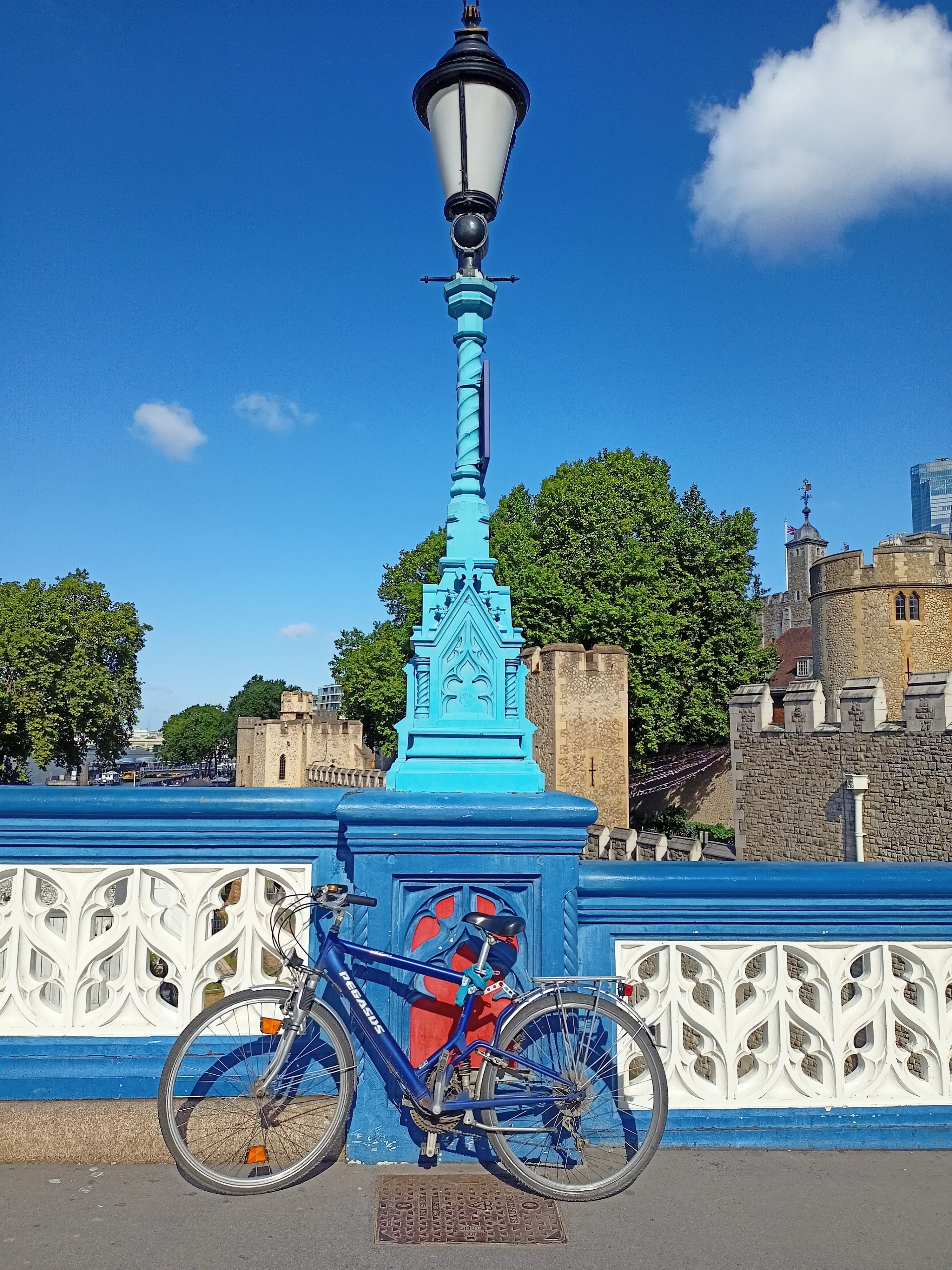 Und er wird stündlich besser. Nicht nur, dass ich ein nettes Cafe auf dem Weg finde und über die Preise erschrecke, der kürzeste Weg in die City führt auch ausgerechnet über die Tower-Bridge! Also radele ich im strahlenden Sonnenschein mit Pegasus über eben jene viel portraitierte Brücke über die Themse und ich muss sagen: Das ist schon ein würdiger Einmarsch für den alten Tretesel und sein Fahrrad.