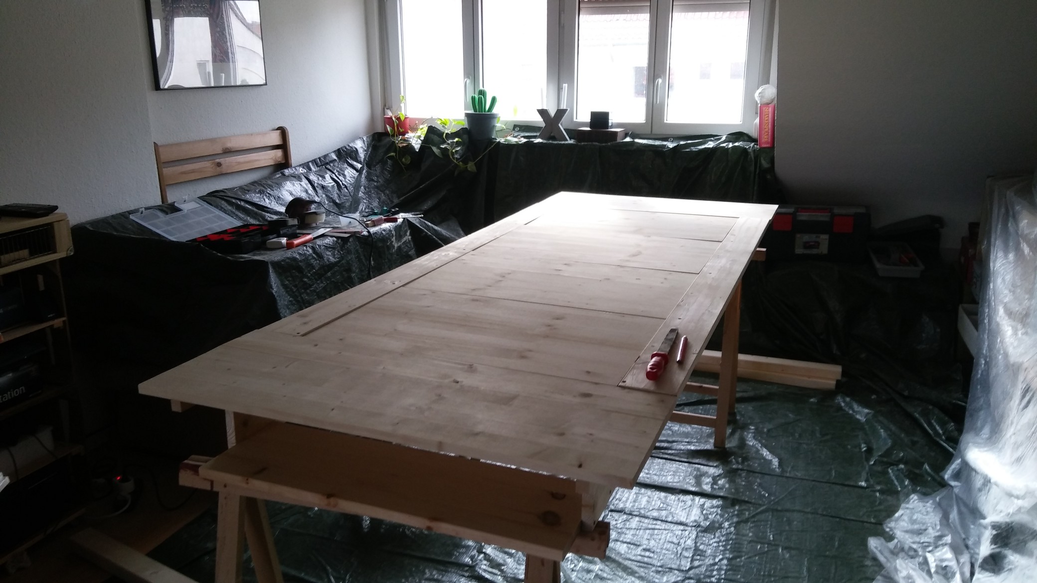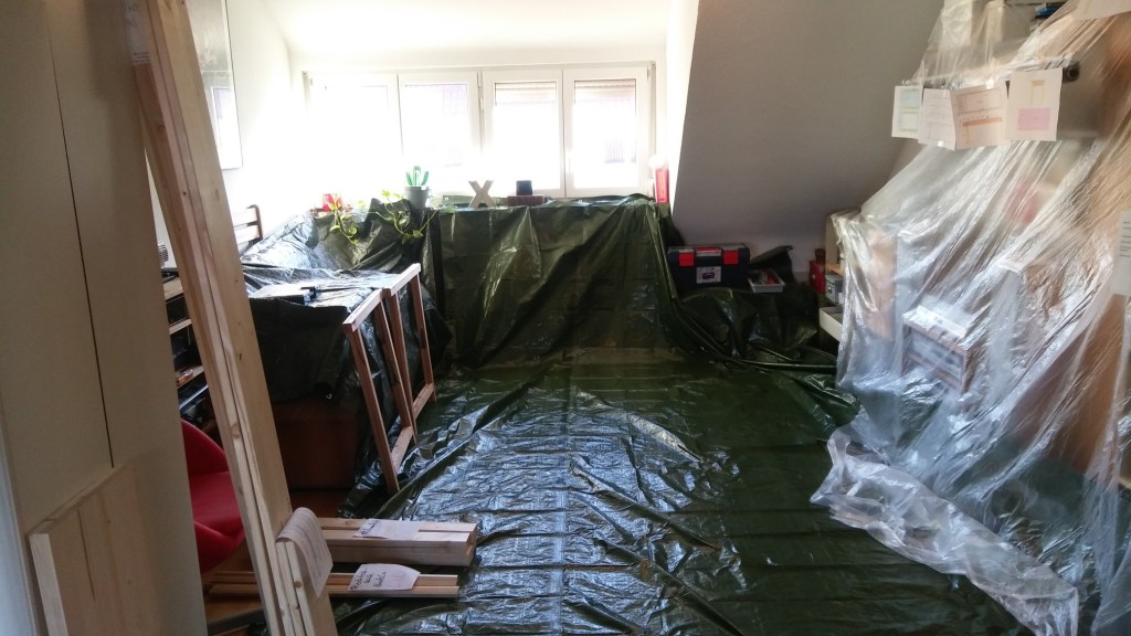 Jetzt sieht mein Wohnzimmer ein wenig aus wie ein Set aus einer Netflix-Serie, in der es um einen kranken Massenmörder geht, der total skilled darin ist, dass die CSI garantiert keine Blutspritzer auf seinem Rauhputz findet. Alles ist mit Folie abgedeckt und an die Wand geschoben, in der Mitte ist die Arbeitsfläche. Natürlich war doch mehr Gewebefolie notwendig, als mir die verdammten Franzosen gelassen haben, als sie 2017 auf dem Epic Empire einfach meine Zeltbodenfolie zwischen ihren französischen Hochglanzrüstungskrams stopften und böse kichernd mit einem Baguette im Mund gen Westen zogen. Mögen Streiks eure Wege hemmen.