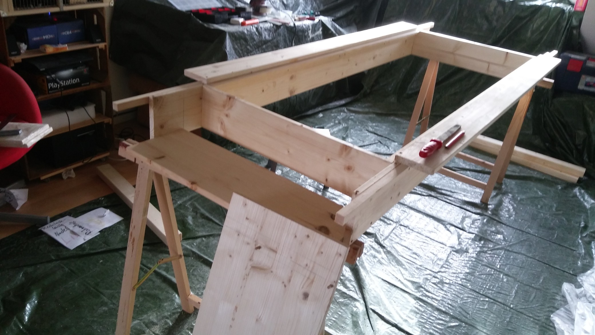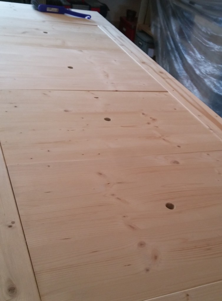Morgen werden die Deckbretter fertig eingepasst und dann kann der Unterboden aufgesetzt werden. Eigentlich kann ich ab da Lackieren, wenn die Farbe passt. Dann kommen die Füße ran und wir können es Tisch nennen.