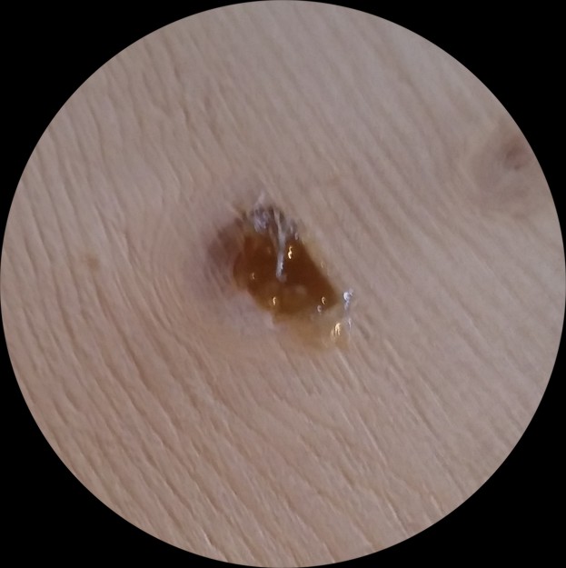 Bei der ganzen Schleiferei ist noch ein Astloch zerbrochen und herausgefallen – direkt an der Oberfläche. Hässliches, zackiges Loch, kaum zu verbessern. Das Internet schlägt Holzspachtelmasse vor, ich habe aber gerade keine da und mache das Loch mit der Heißklebepistole zu. Ausgebildete Schreiner bekommen an dieser Stelle einen Schreikrampf und hoffentlich stellt nie jemand eine heiße Teetasse drauf. Ach ja: das geklebte Dübelloch von gestern hält bis jetzt, man kann auch mal Glück haben.