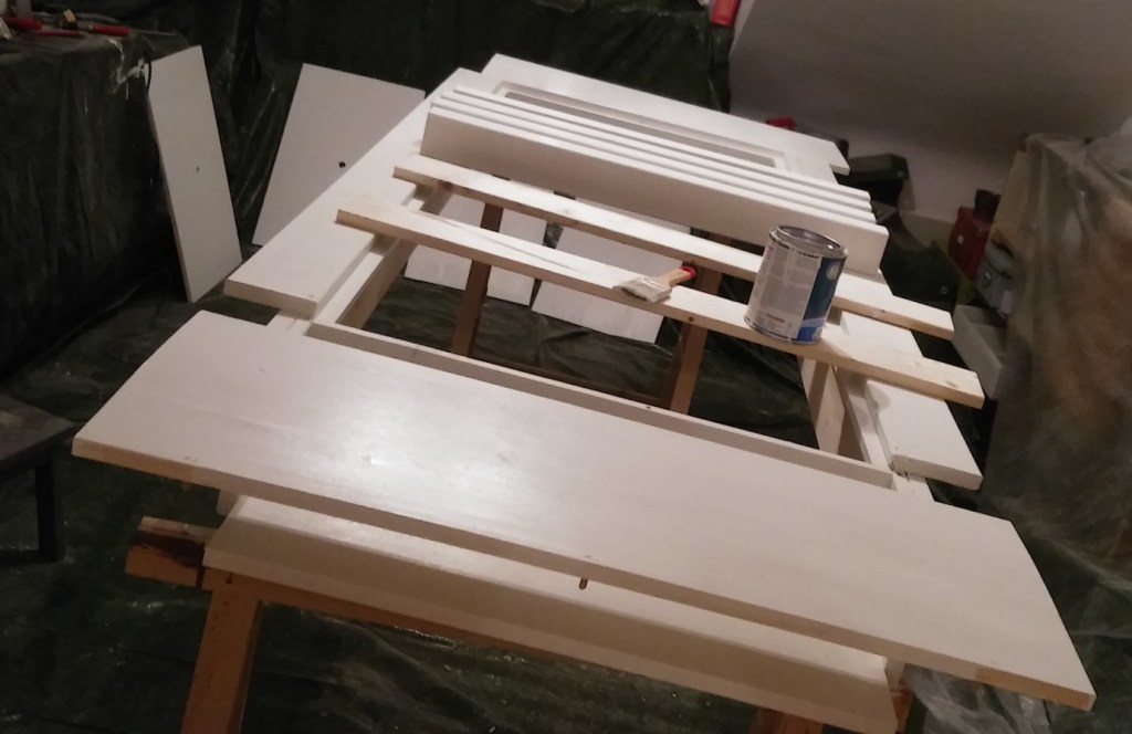 Jetzt ist die Oberseite und die meisten Wände schön weiß, morgen drehe ich den Kasten einmal und pinsele den Rest. Dann kommen die Füße ran (wie bohre ich die Löcher, wie krieg ich alles gerade …) und dann …