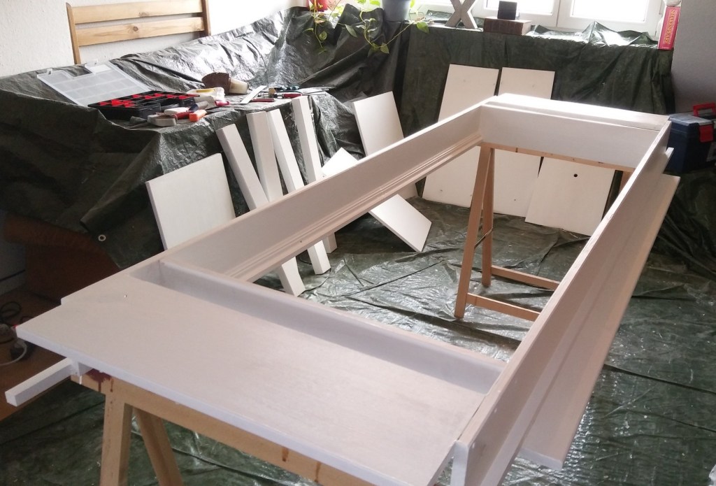 Der zentrale Tischkasten (Kopfüber), fertig lackiert. Endstand Freitag.