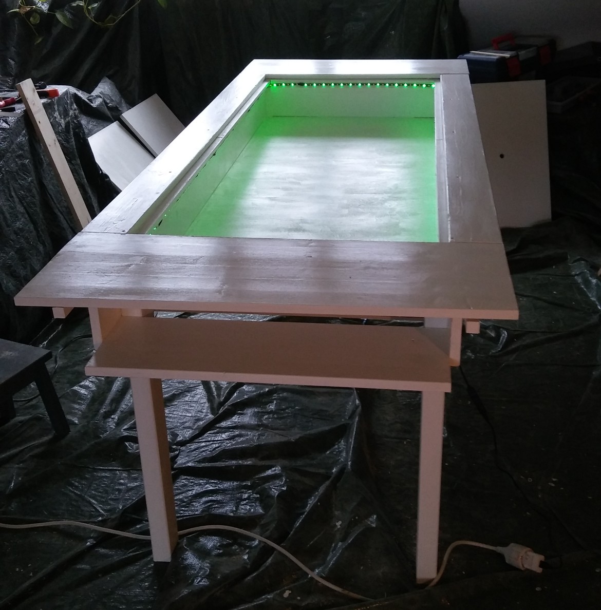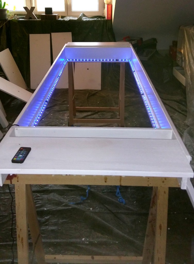 Natürlich hätte ich auf die Stimmen aus dem internet hören sollen, die mir prophezeiten, dass diese billigen LED-Streifen aus China nicht auf Holzoberflächen kleben bleiben. Aber Holzleim wirkte an kritschen Stellen bei dem Diodenband-Gefummel offensichtlich wahre Wunder (Bis jetzt. Bis sie mir in zwei Wochen entgegenkommen. Dann fluche ich Dinge, bei denen meine Gangster-Rap-Schüler verstört erröten würden, reiße den Rotz raus, schleife fluchend, lackiere neu, kaufe mir was Teures und installiere das). Aber das Licht ist drin, man kann es ansteuern, es macht bunt und läuft über einen USB-Anschluss.