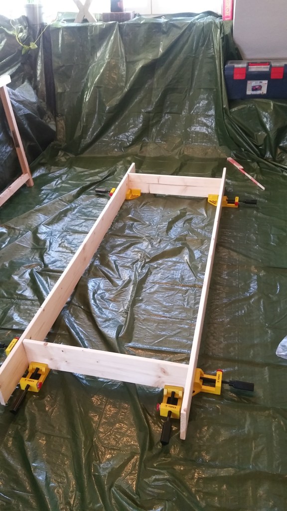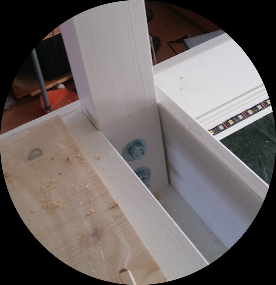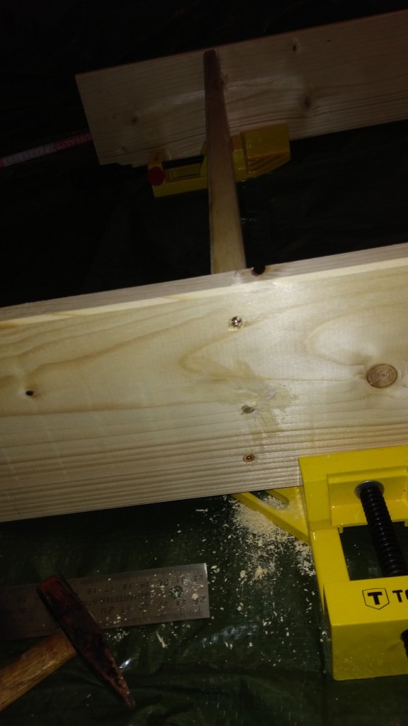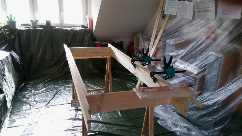Natürlich sind die Rahmenbretter doch nicht ganz gerade, obwohl ich über ihre gesamte Länge intensiv gelinst habe, als wäre ich ein schwedischer Musketier, der einen spanischen Kürasier am Horizont erspät. Dummerweise ist eines über die kurze Länge leicht gebogen – wer rechnet mit so was. Bis jetzt macht das nix, aber ich denke, die Beine wirklich gerade reinzuschrauben wird dann wohl der knifflige Part.