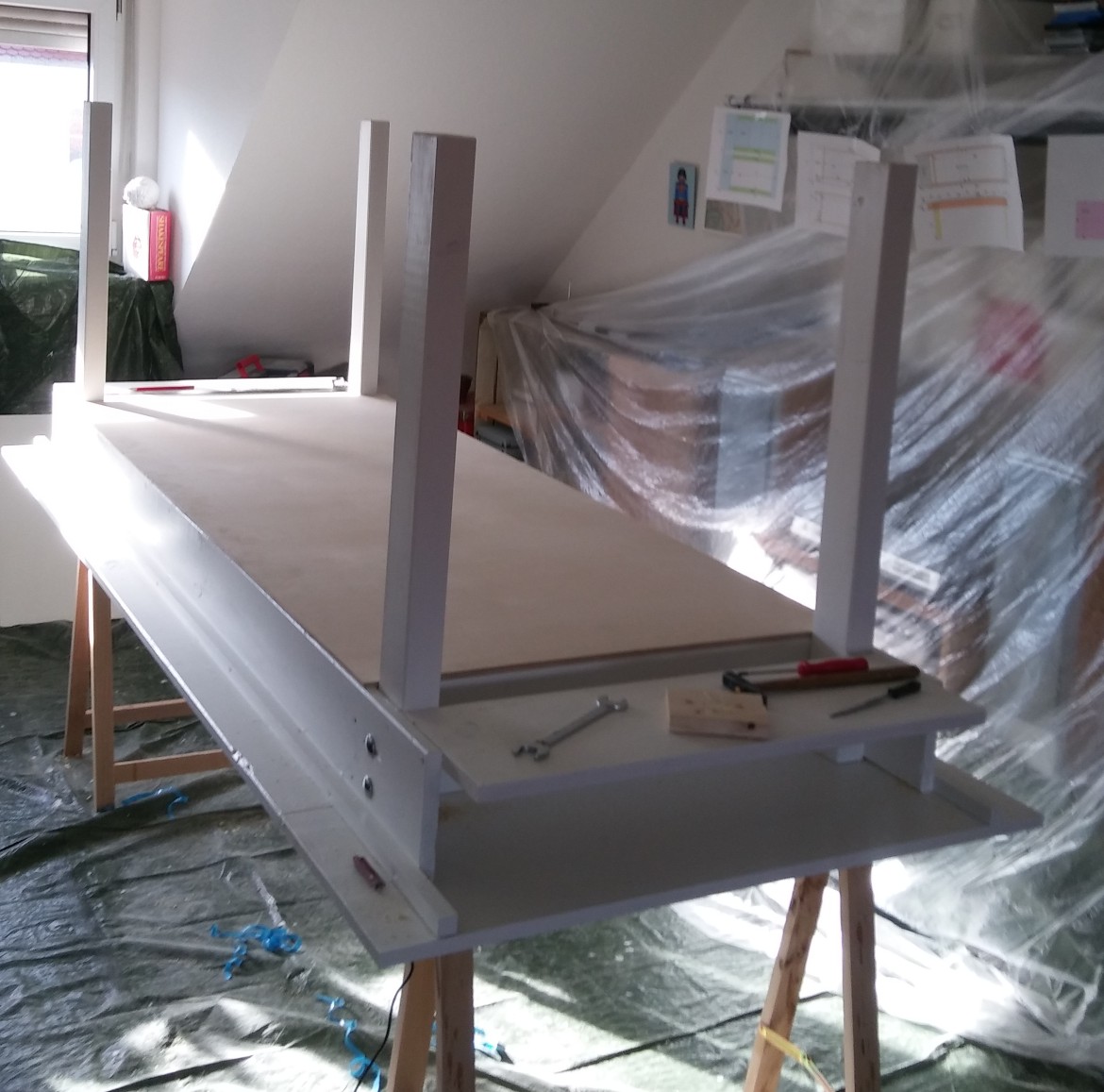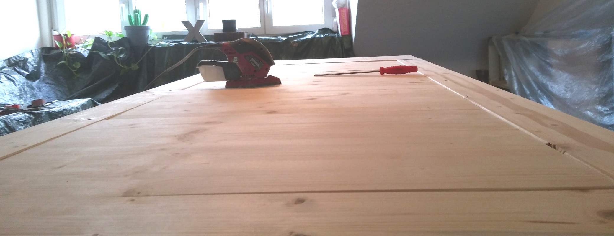 Apropos Schleifstaub und Bohrmehl: das Zeug verteilt sich wie Giftgas in der gesamten Wohnung. Man schleppt es an den Socken und Hausschlappen mit rum. Sobald das Werkzeug, die Folie und der alte Tisch weg ist, muss ich an eine große Grundreinigung. Ich hasse Putzen, aber diesmal ist es die Sache wert.