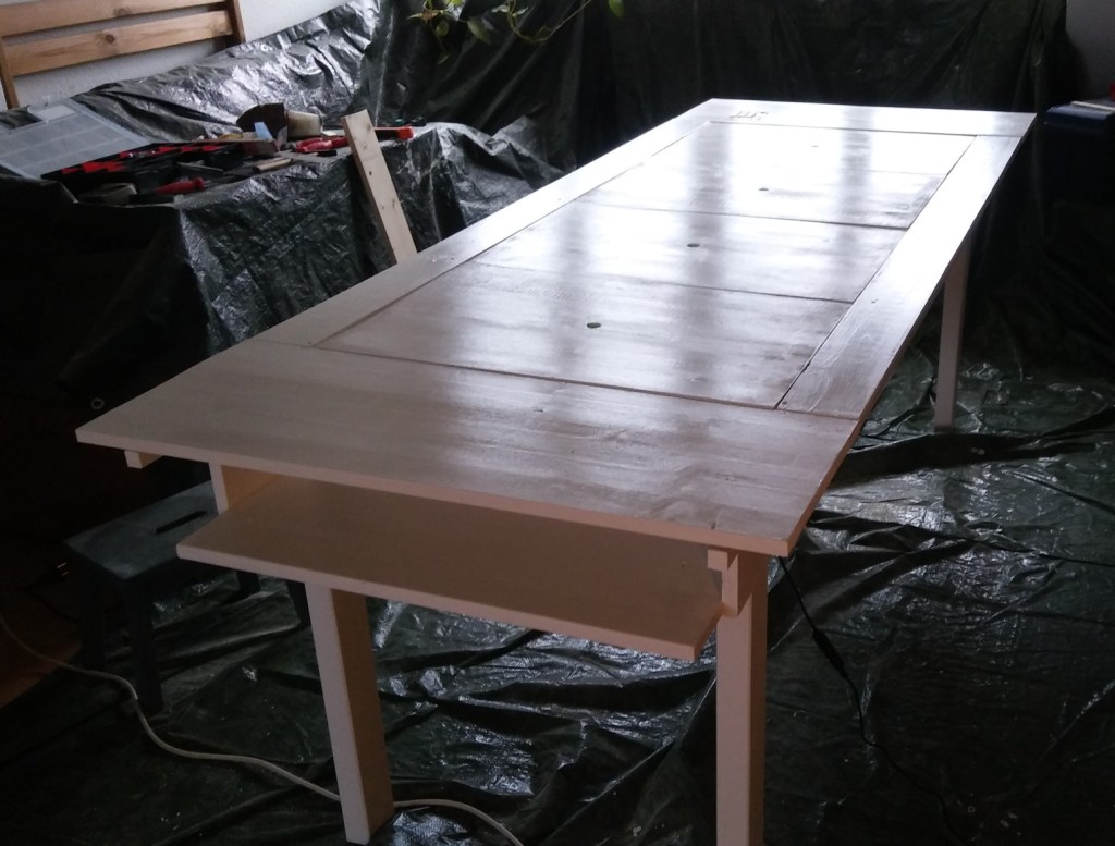 Aber es hat viel länger gedauert, als ich dachte. Was ich nicht mehr sehen kann sind Lacknasen, die haben bei mir inzwischen die selbe Wertigkeit wie Arschnasen, von beiden gibt es zu viele auf der Welt. Man kann noch so sorgfältig pinseln und abstreichen, kaum kuckst du auf den Tisch aus einer anderen Perspektive, entdeckst du die hässlichen kleinen Anstrich-Akne und greifst entnervt zum Schleifpapier.