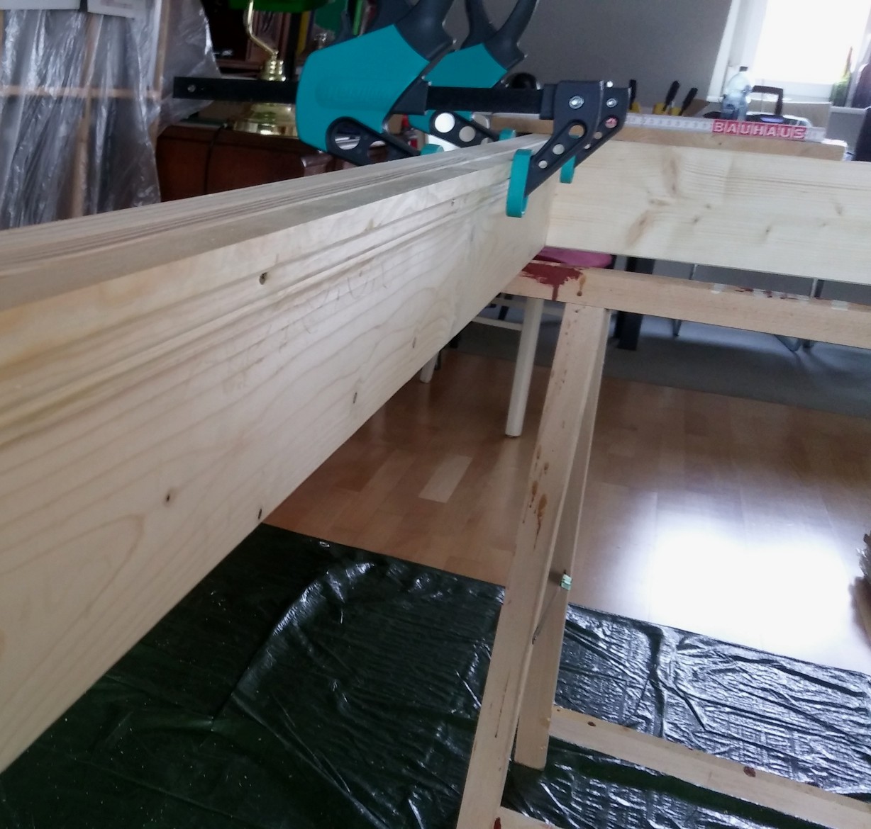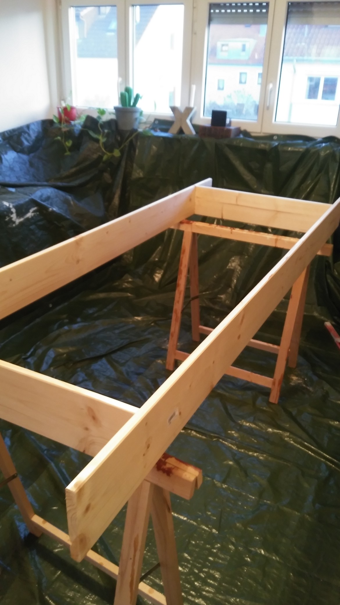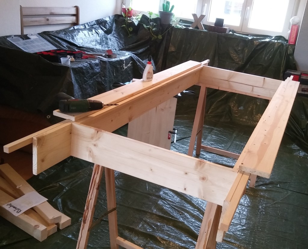 Jetzt steht in meinem Wohnzimmer das fertig geleimte und geschraubte Grundgestell, sozusagen der Tischkasten und es ging bis jetzt ganz ordentlich, ohne Schreikrampf. Ich habe ja auch brav alles drei Mal gemessen, bevor ich geleimt habe. Morgen kommen Leisten und Seitenauflagen dazu, dann ist es schon fast ein Tisch.